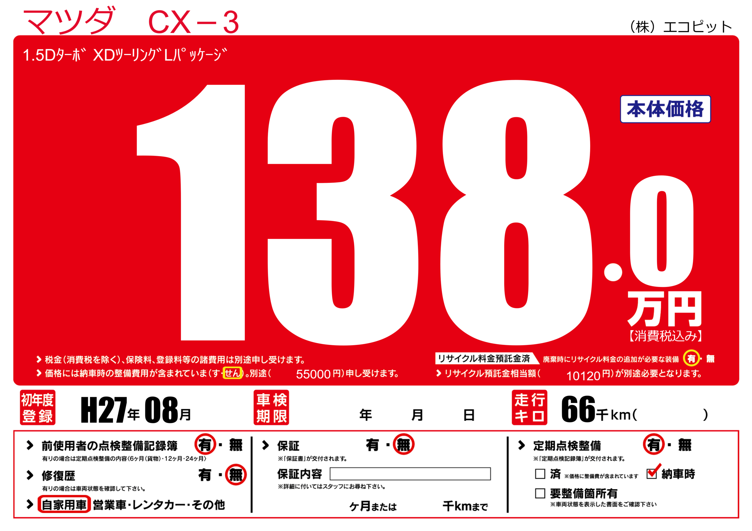 | 車名 | マツダ CX-3 | グレード ミッション 排気量 |