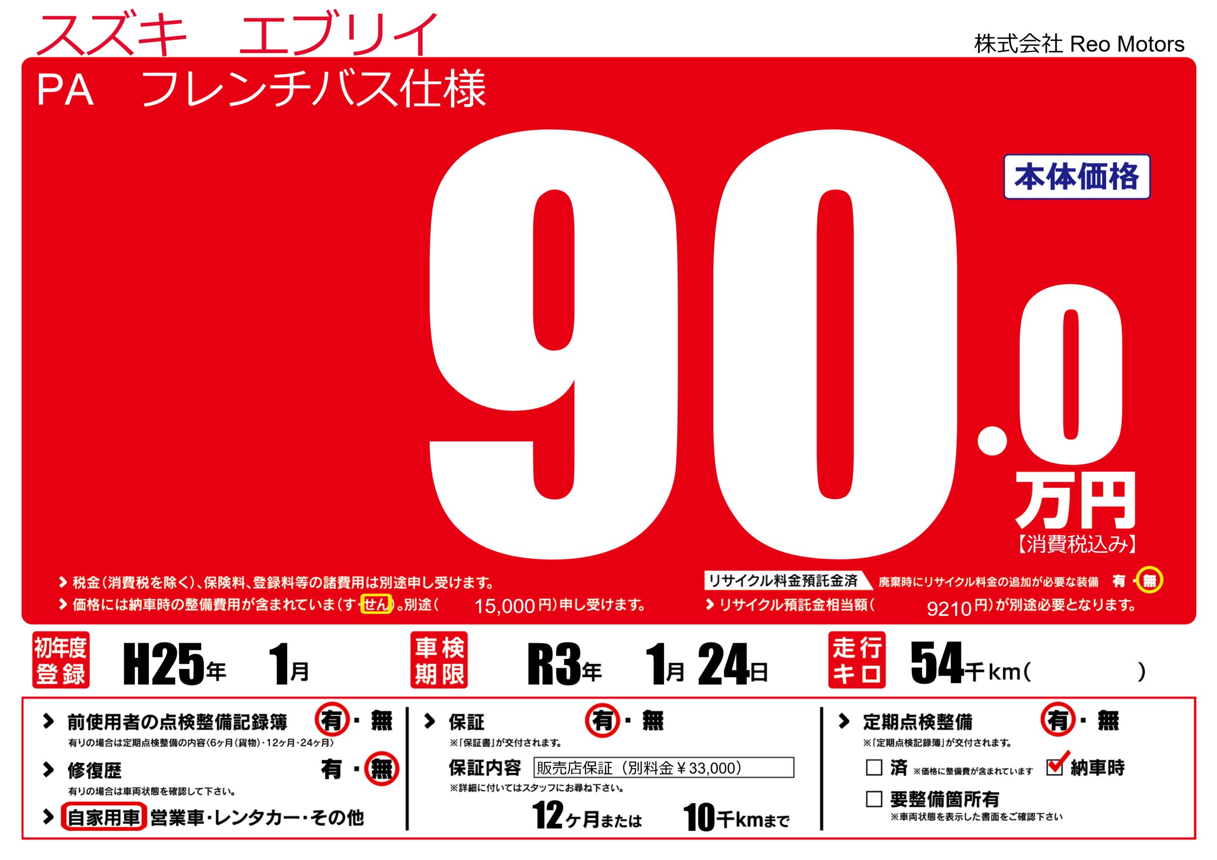 | 車名 | スズキ エブリイ | グレード ミッション 排気量 |