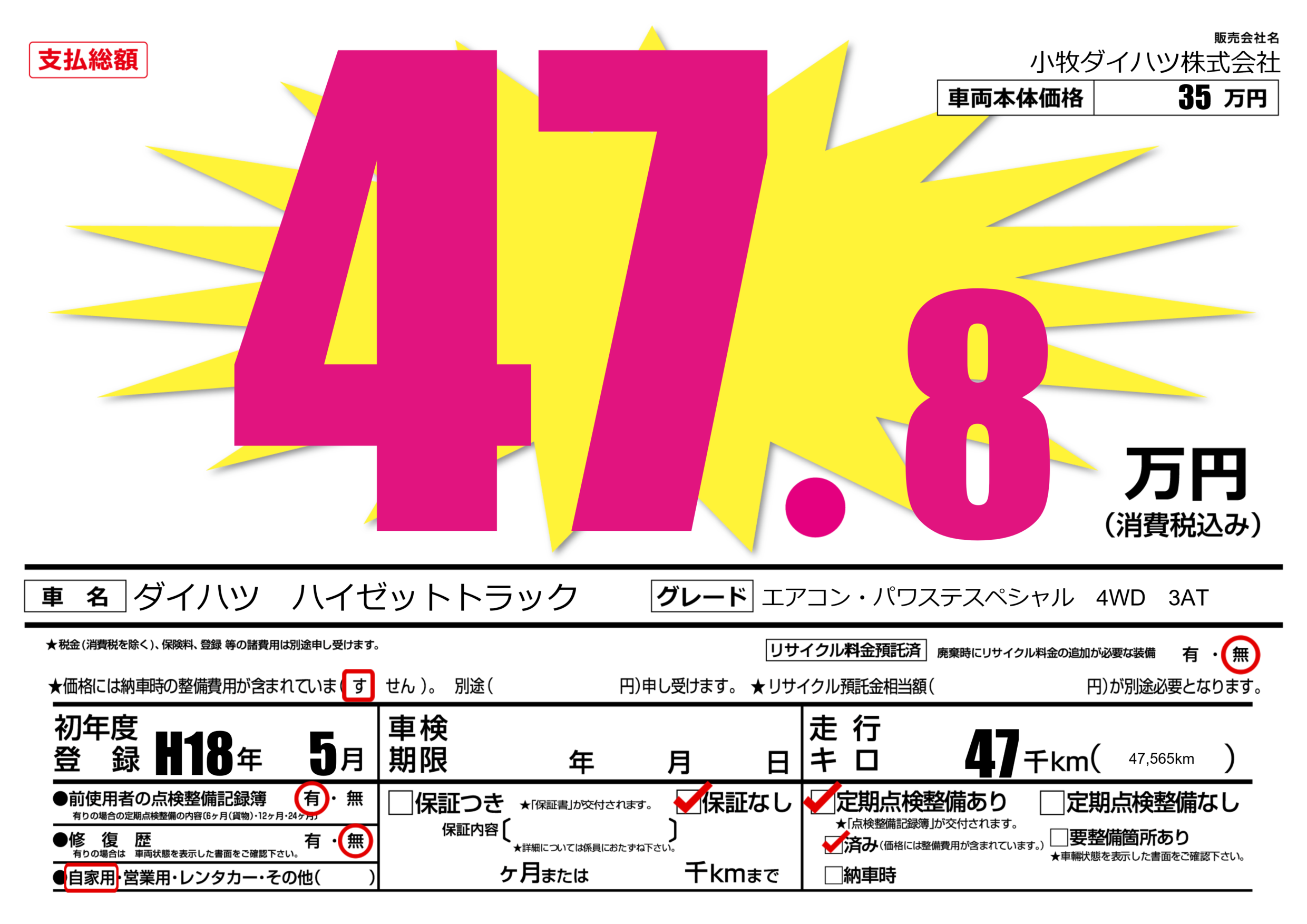 | 定期点検整備 | 定期点検整備あり 定期点検整備済み | ||