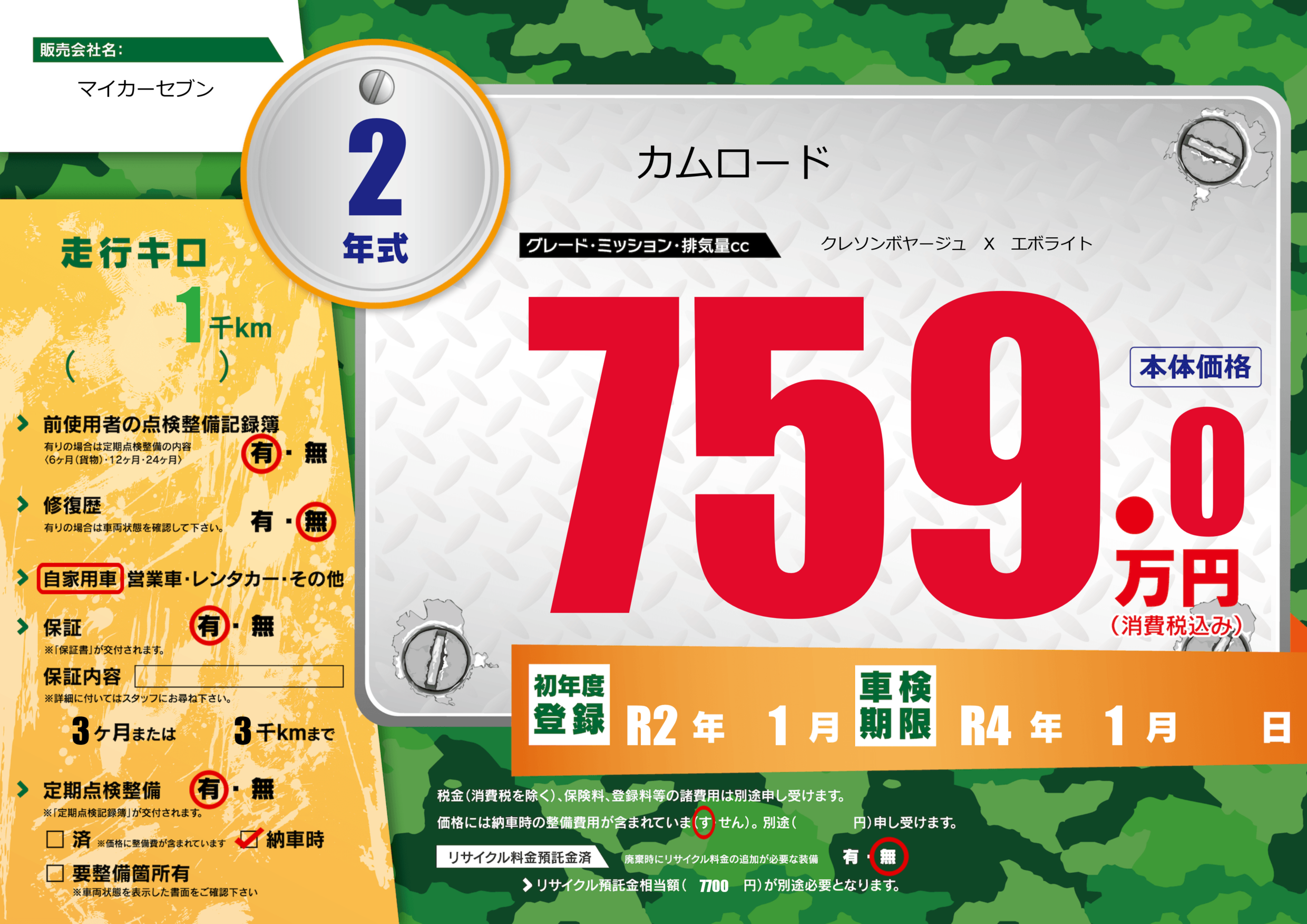 | 車名 | カムロード | グレード ミッション 排気量 |