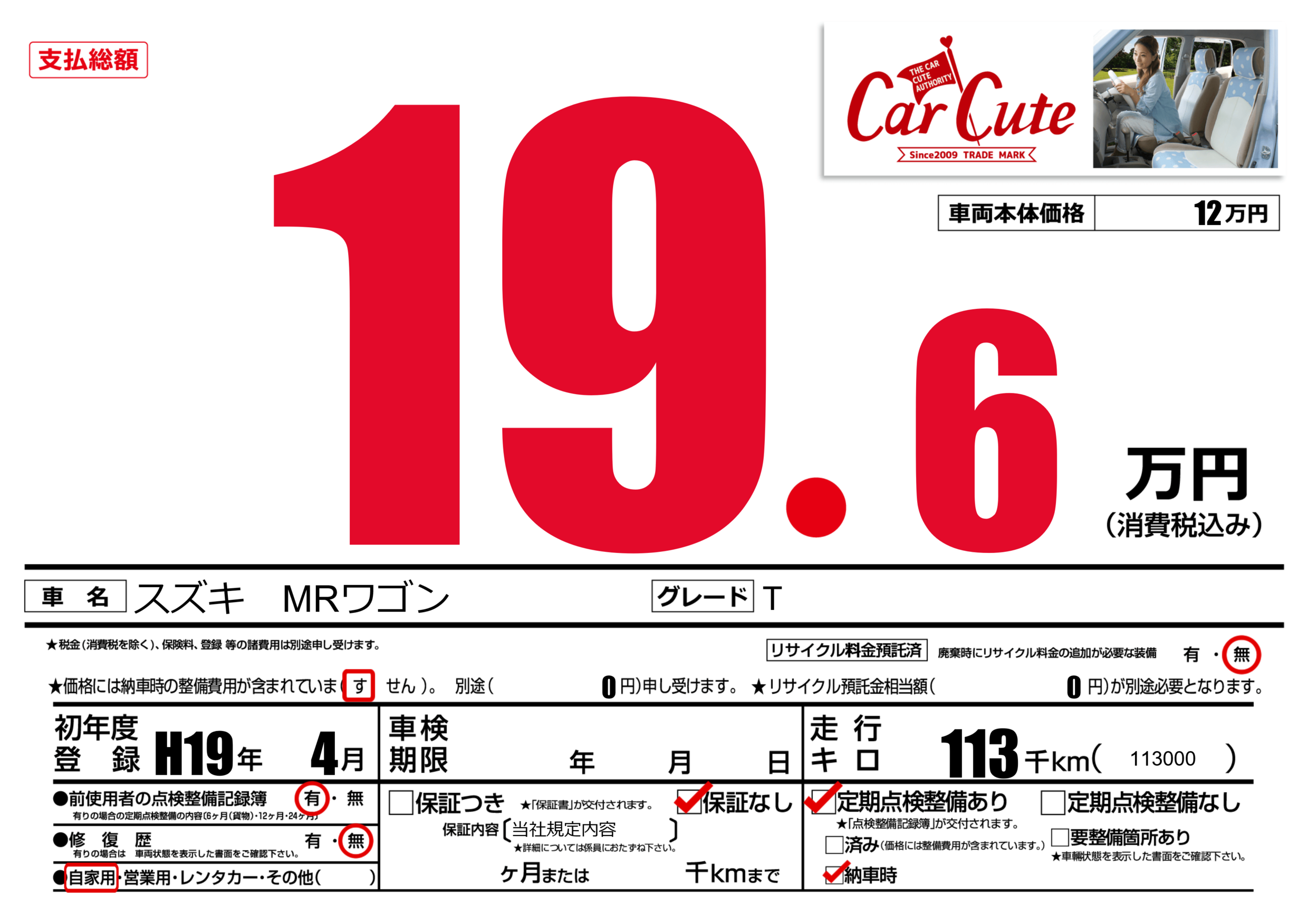 | 定期点検整備 | 定期点検整備あり 納車時あり | ||