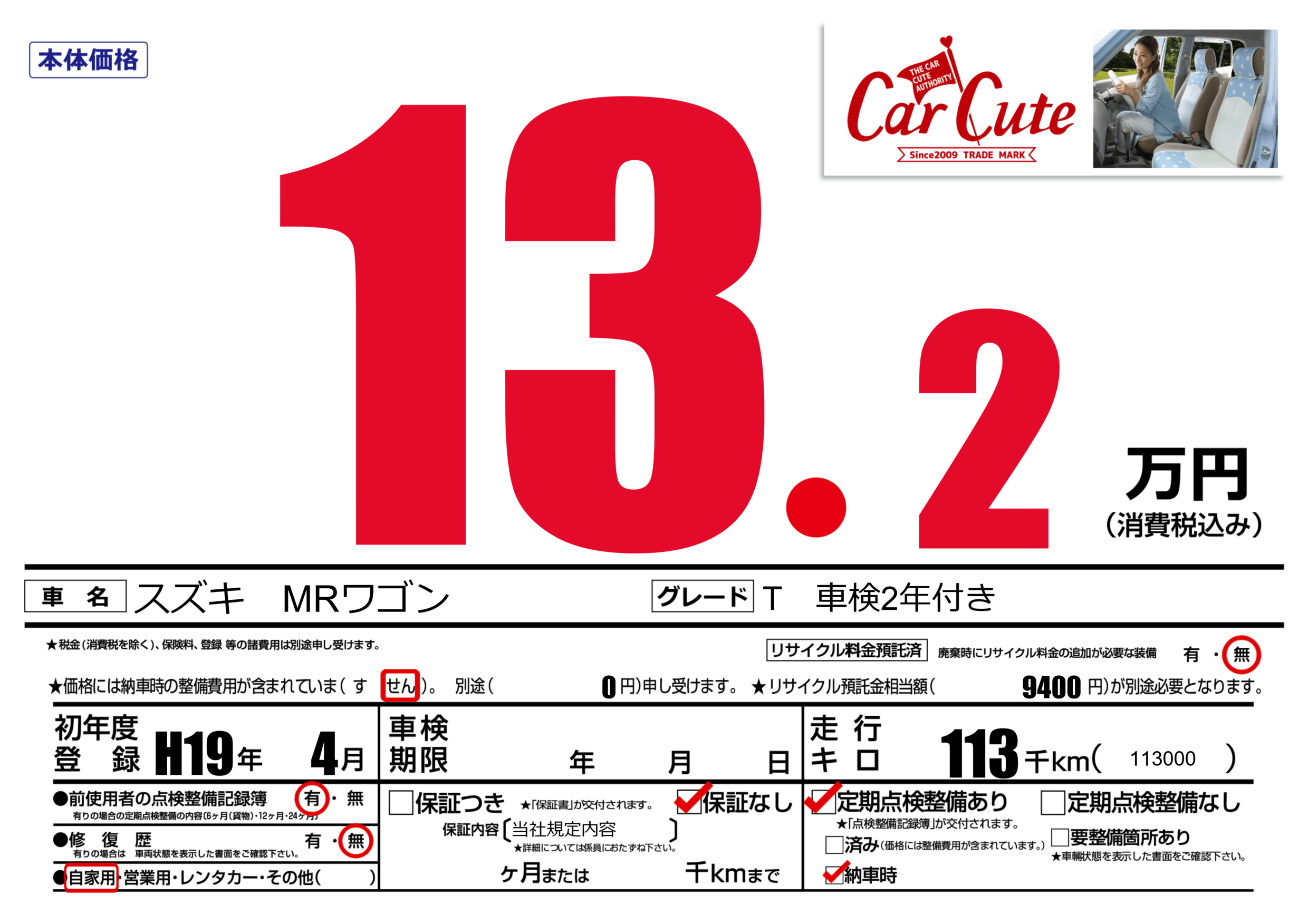 | 車名 | スズキ MRワゴン | グレード ミッション 排気量 |