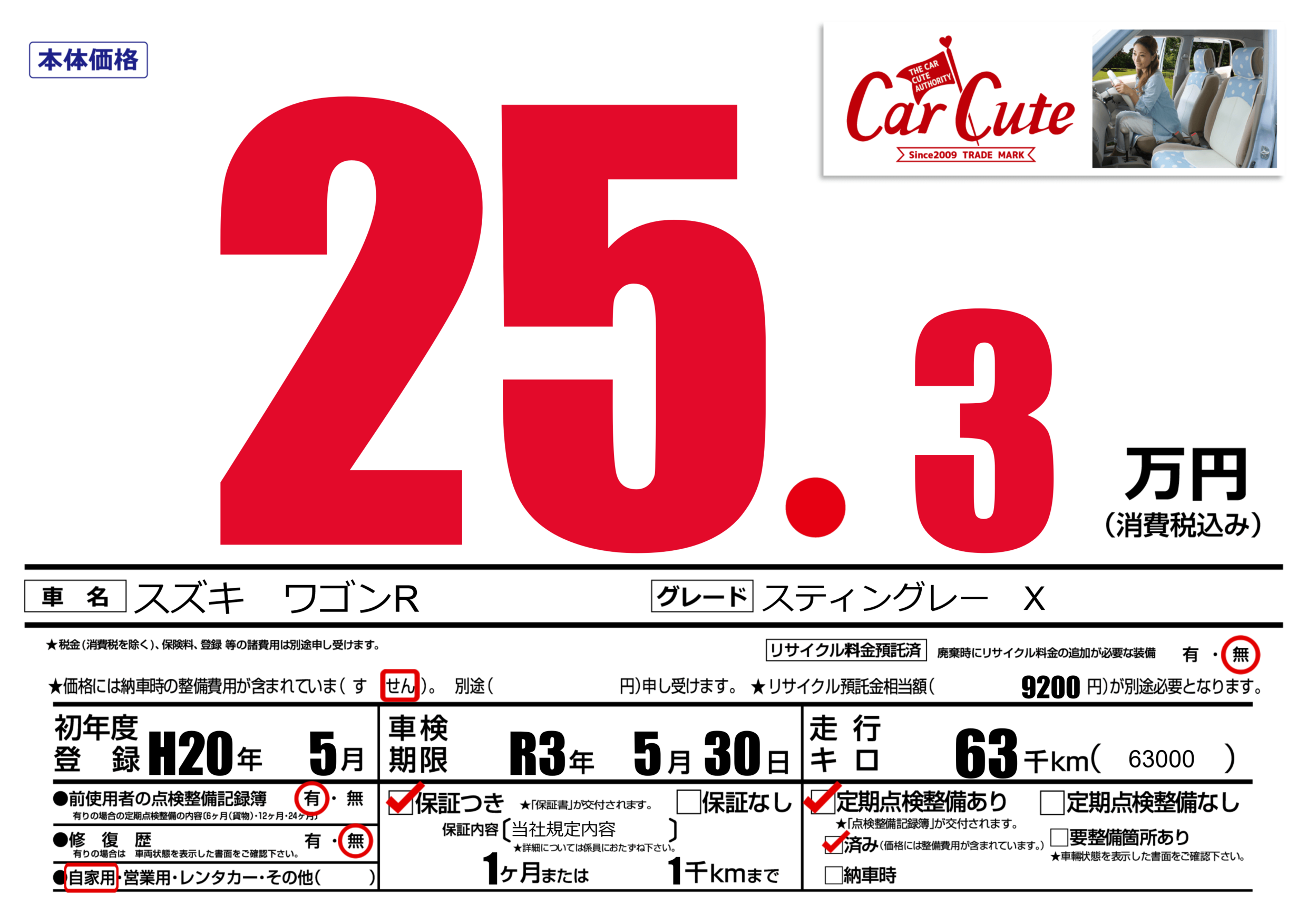 | 走行キロ | 6.3万km | 初年度登録 | H20年5月 |