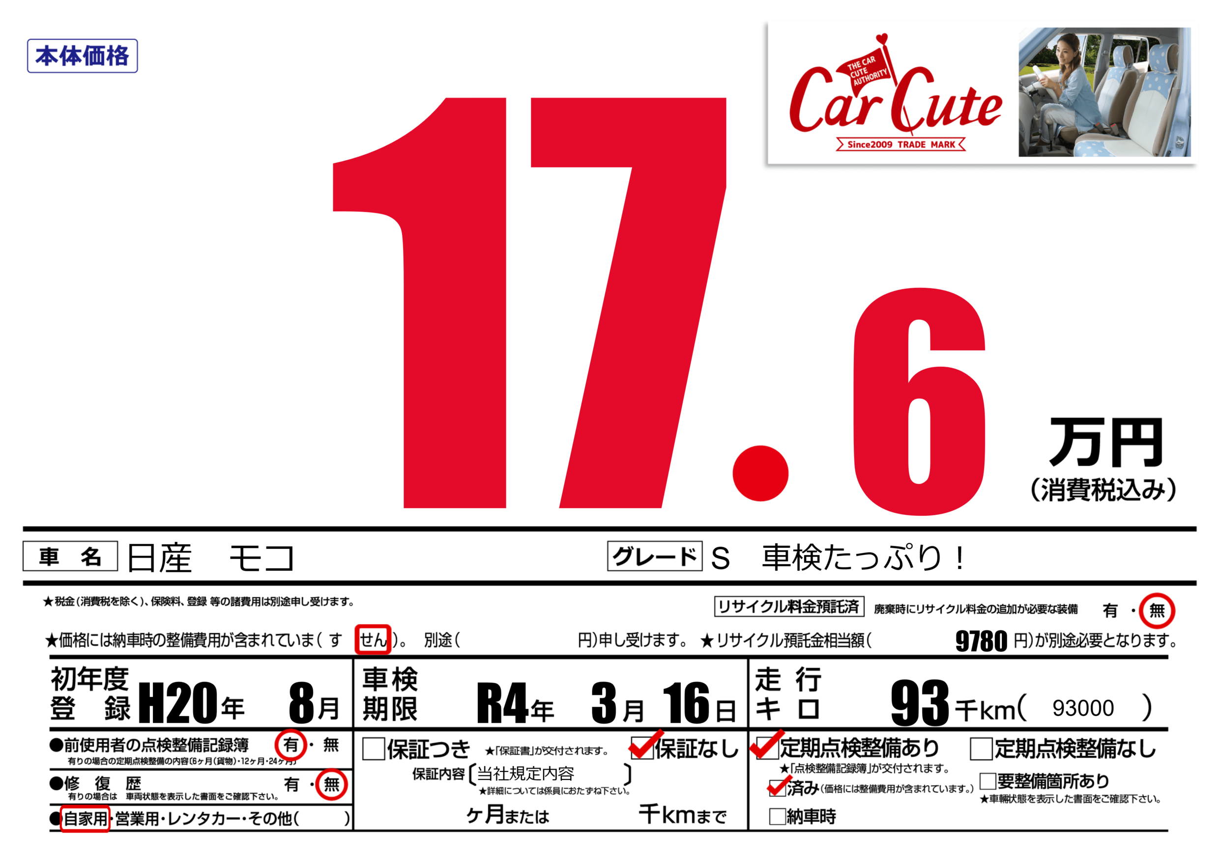 | 車名 | 日産 モコ | グレード ミッション 排気量 |