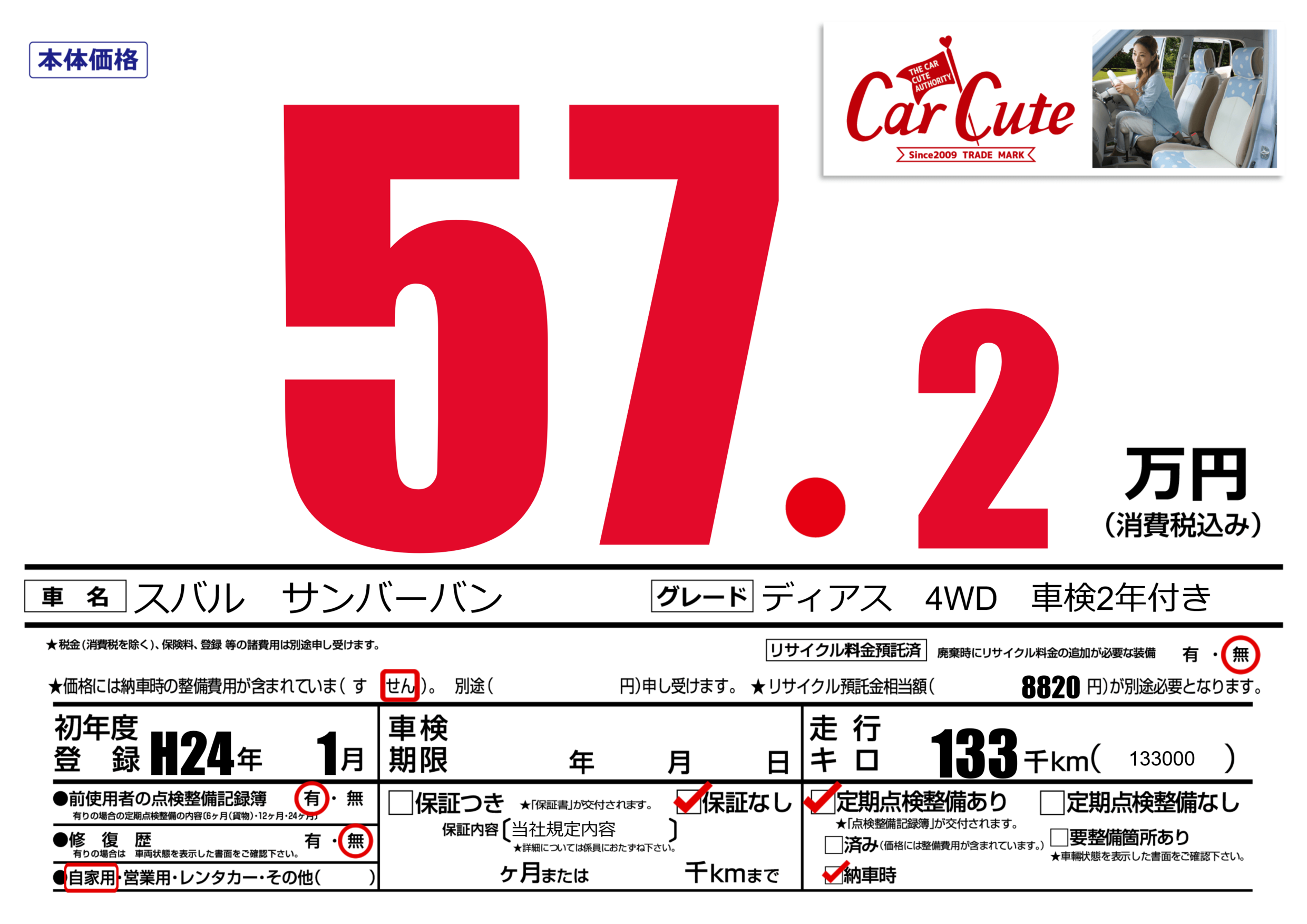 | 車名 | スバル サンバーバン | グレード ミッション 排気量 |