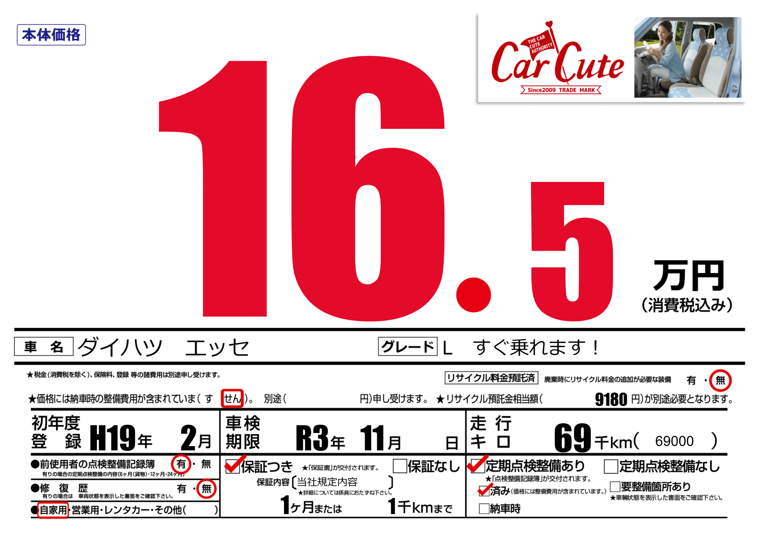 | 車名 | ダイハツ エッセ | グレード ミッション 排気量 |