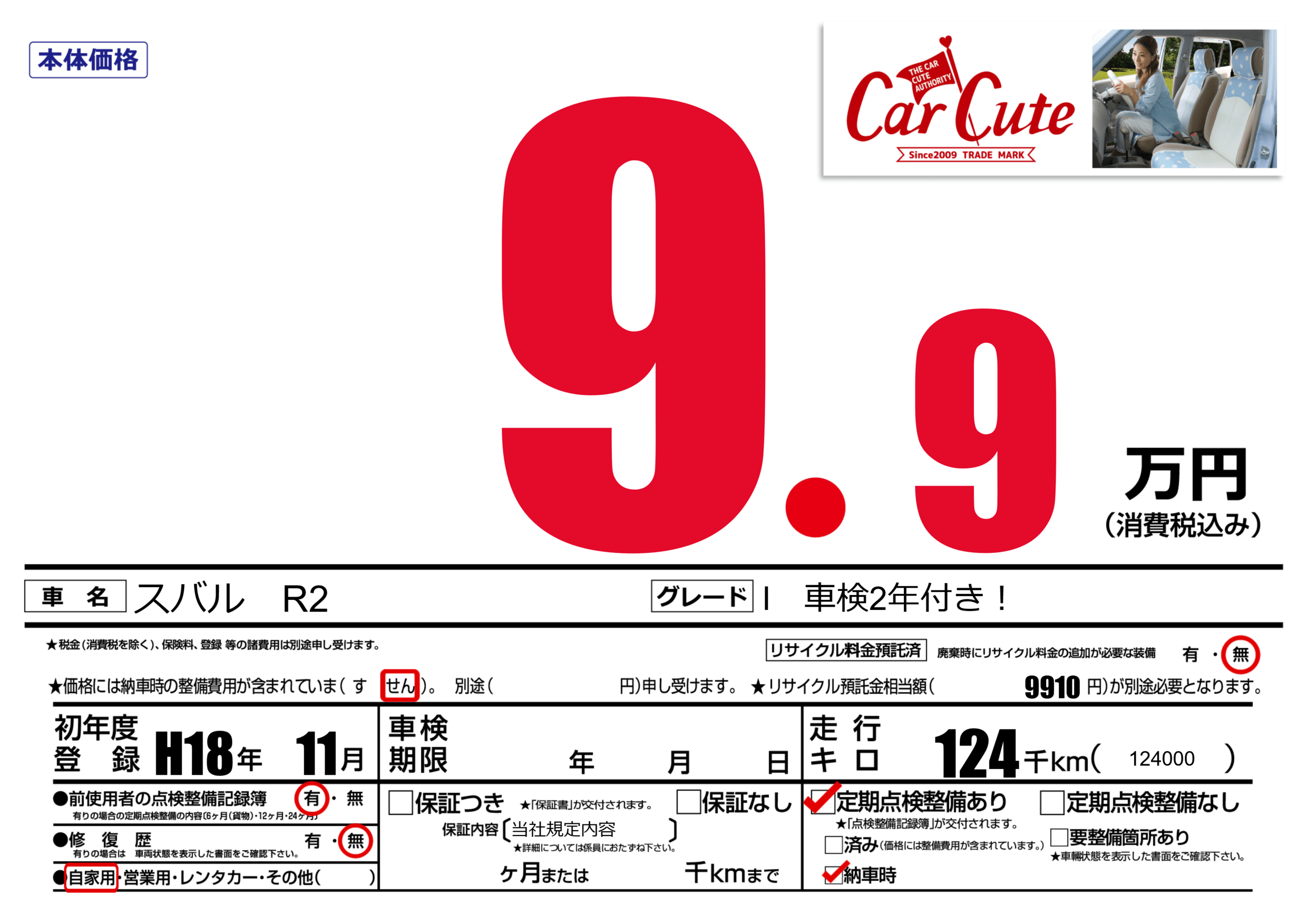 | 車名 | スバル R2 | グレード ミッション 排気量 |