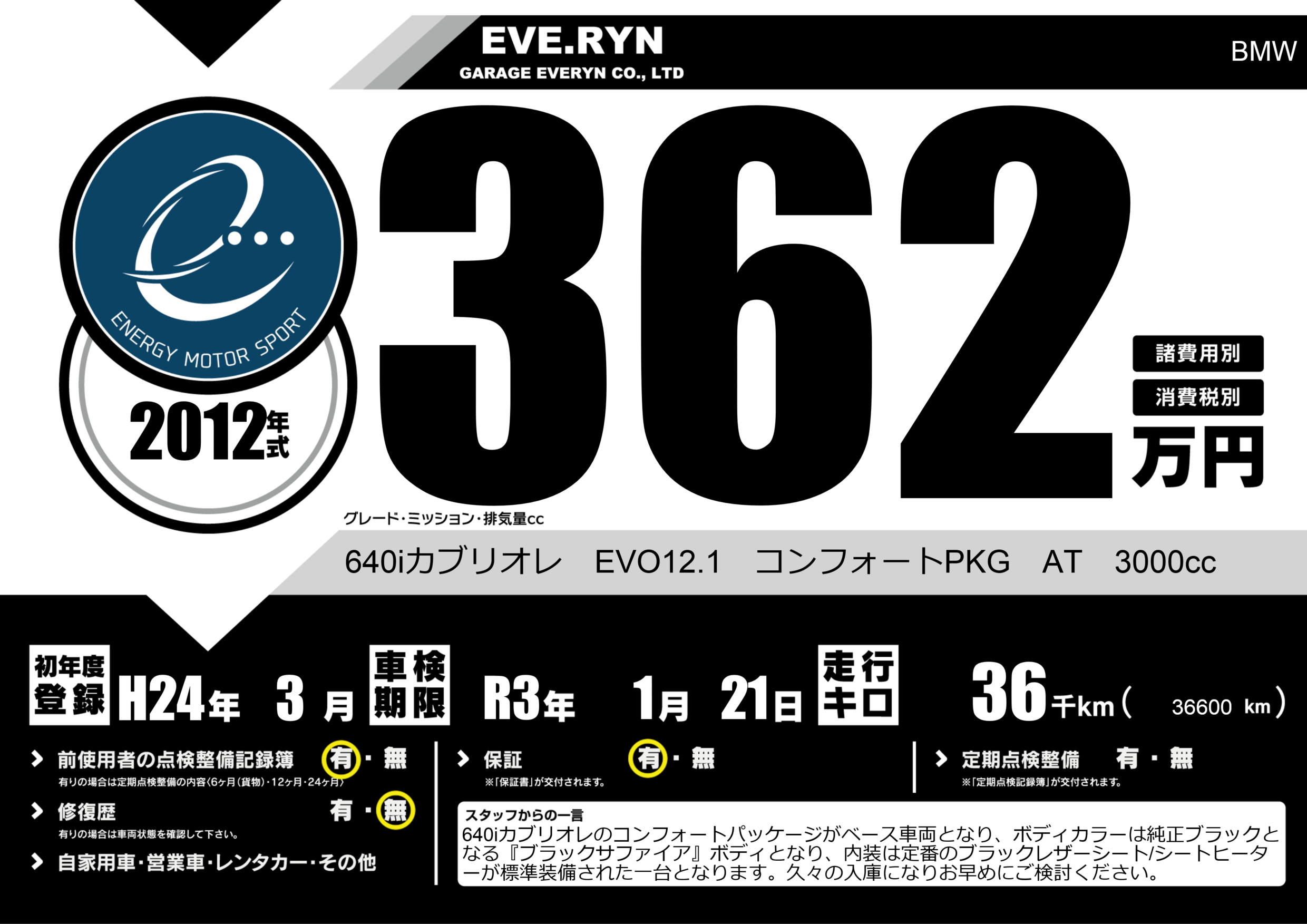 640iカブリオレ EVO12.1 コンフォートPKG AT 3000cc |