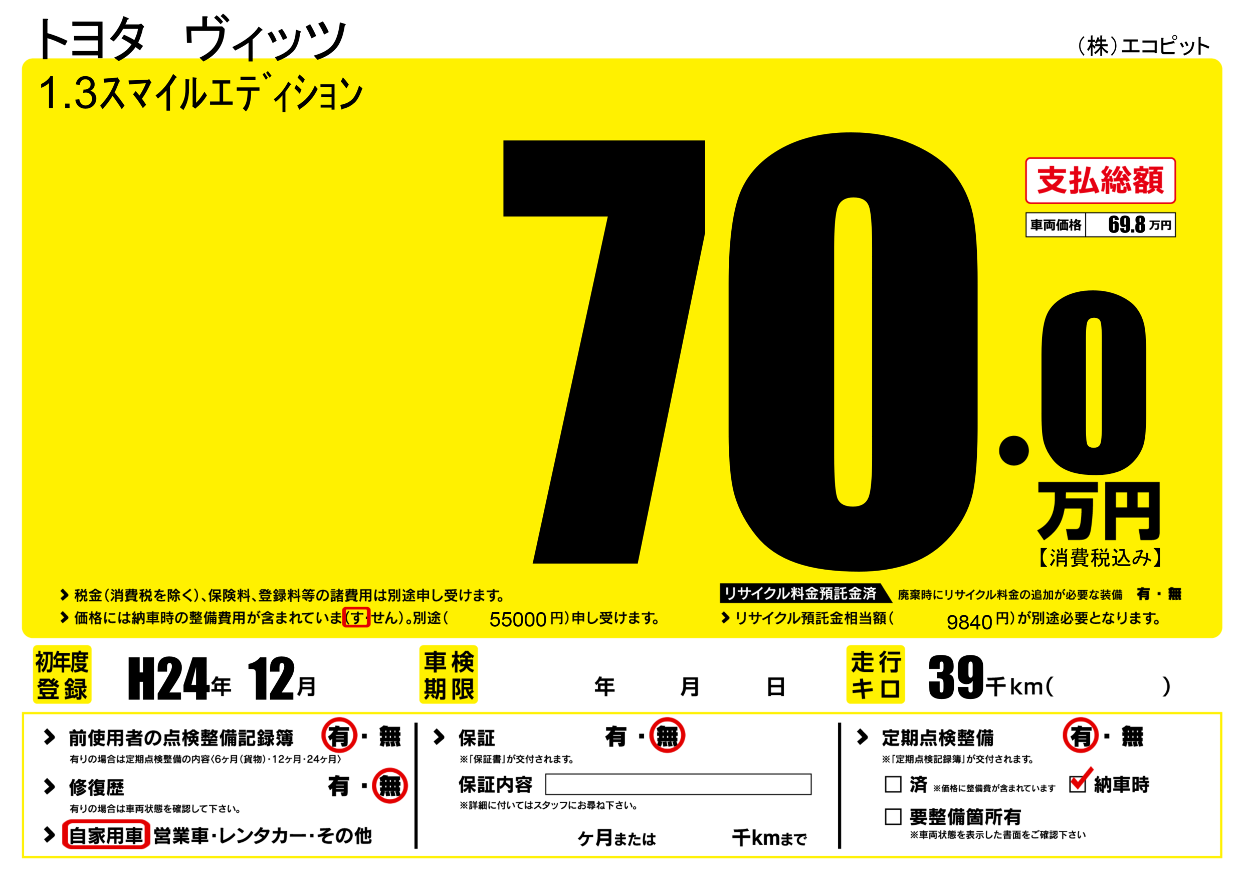 なし | リサイクル預託金相当額 | ( 1円)が別途必要 |