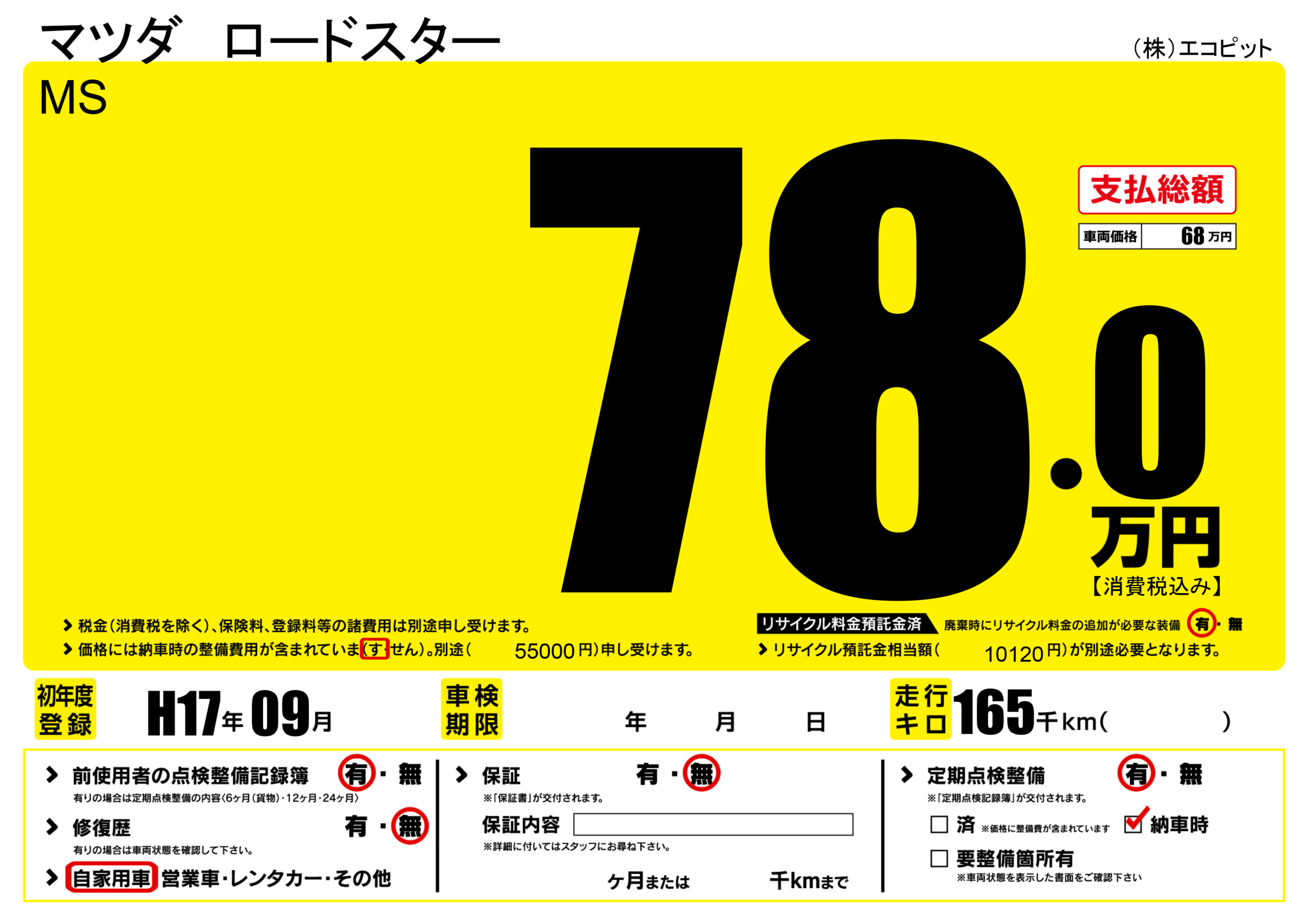 | 走行キロ | 16.5万km | 初年度登録 | H17年09月 |