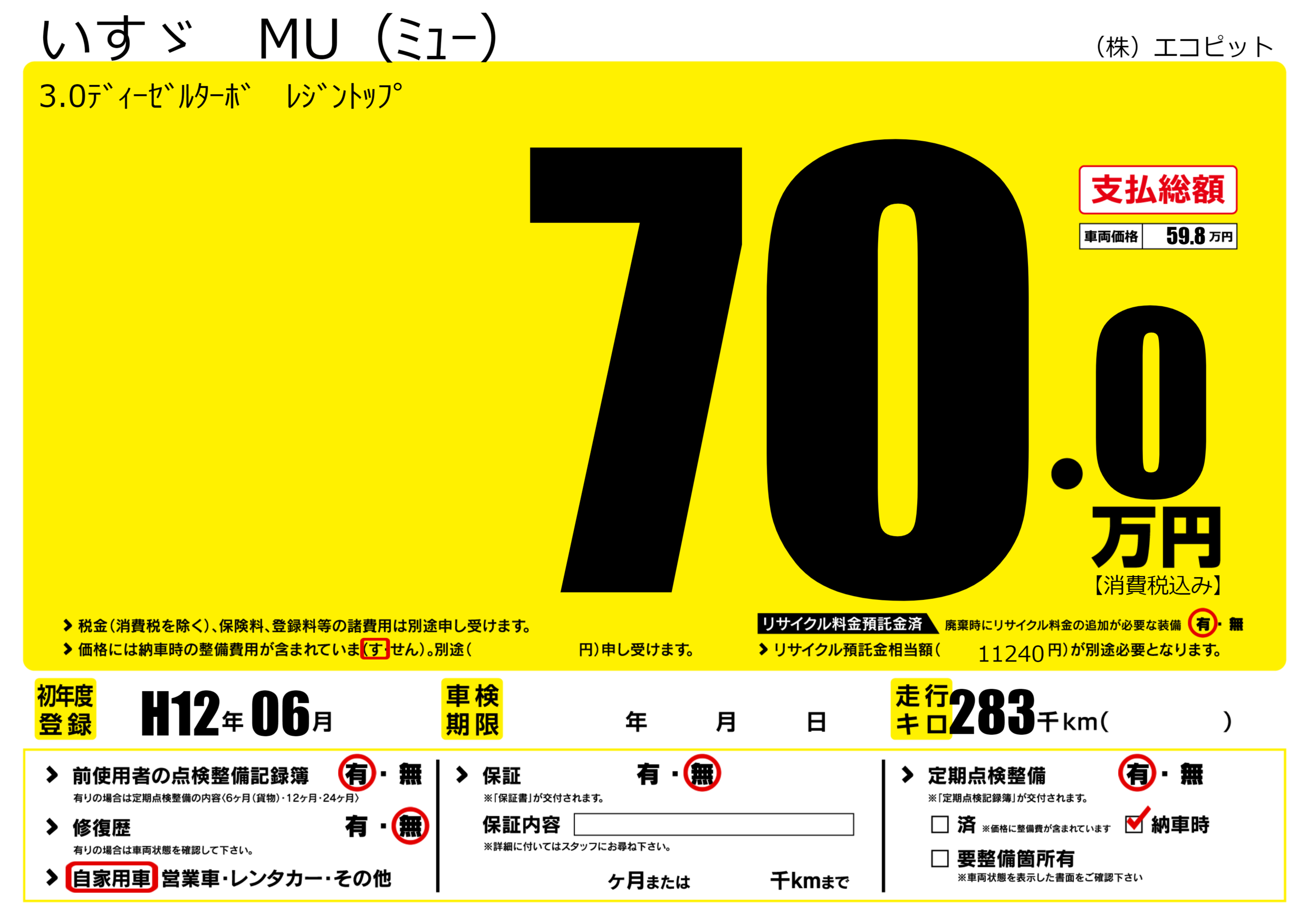 | 走行キロ | 28.3万km | 初年度登録 | H12年06月 |