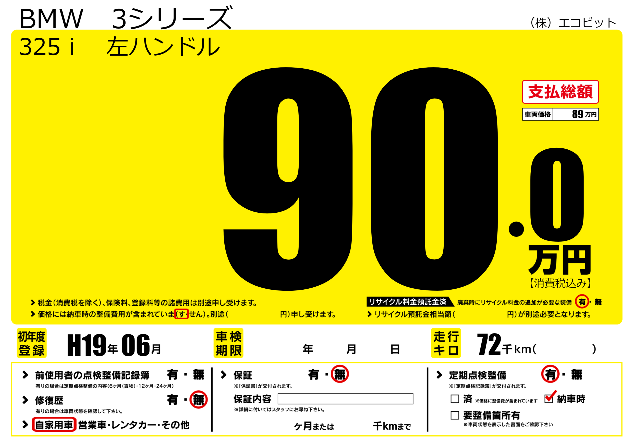 あり | リサイクル預託金相当額 | ( 0円)が別途必要 |