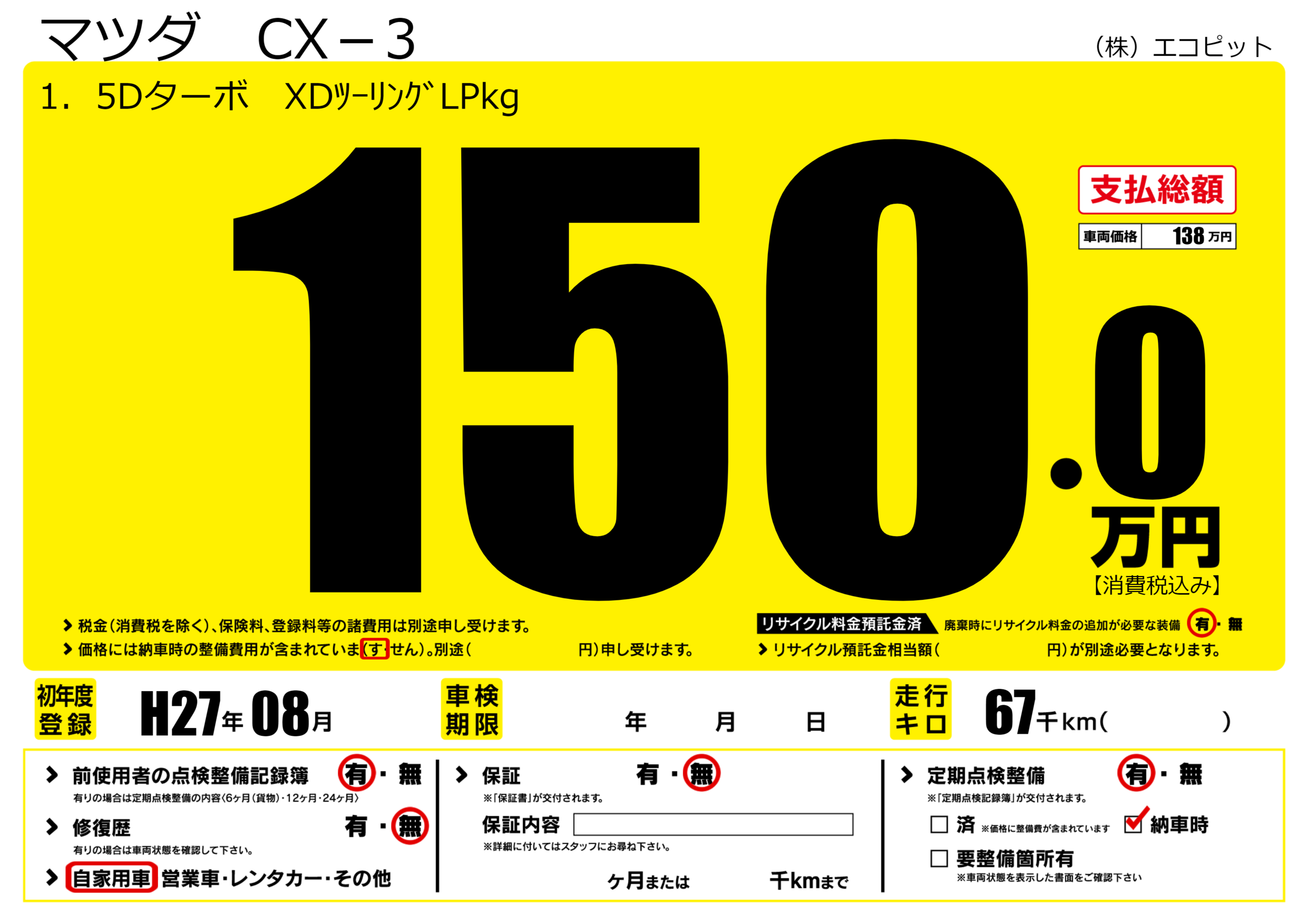 あり | リサイクル預託金相当額 | ( 0円)が別途必要 |