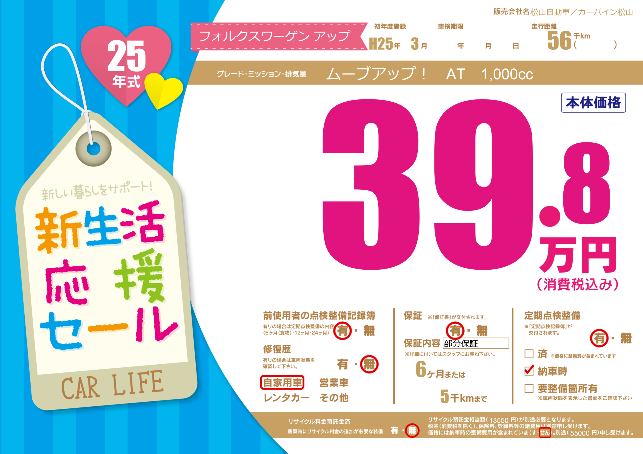 保証付き 保証内容(部分保証) 6ヶ月または(5)千kmまで |