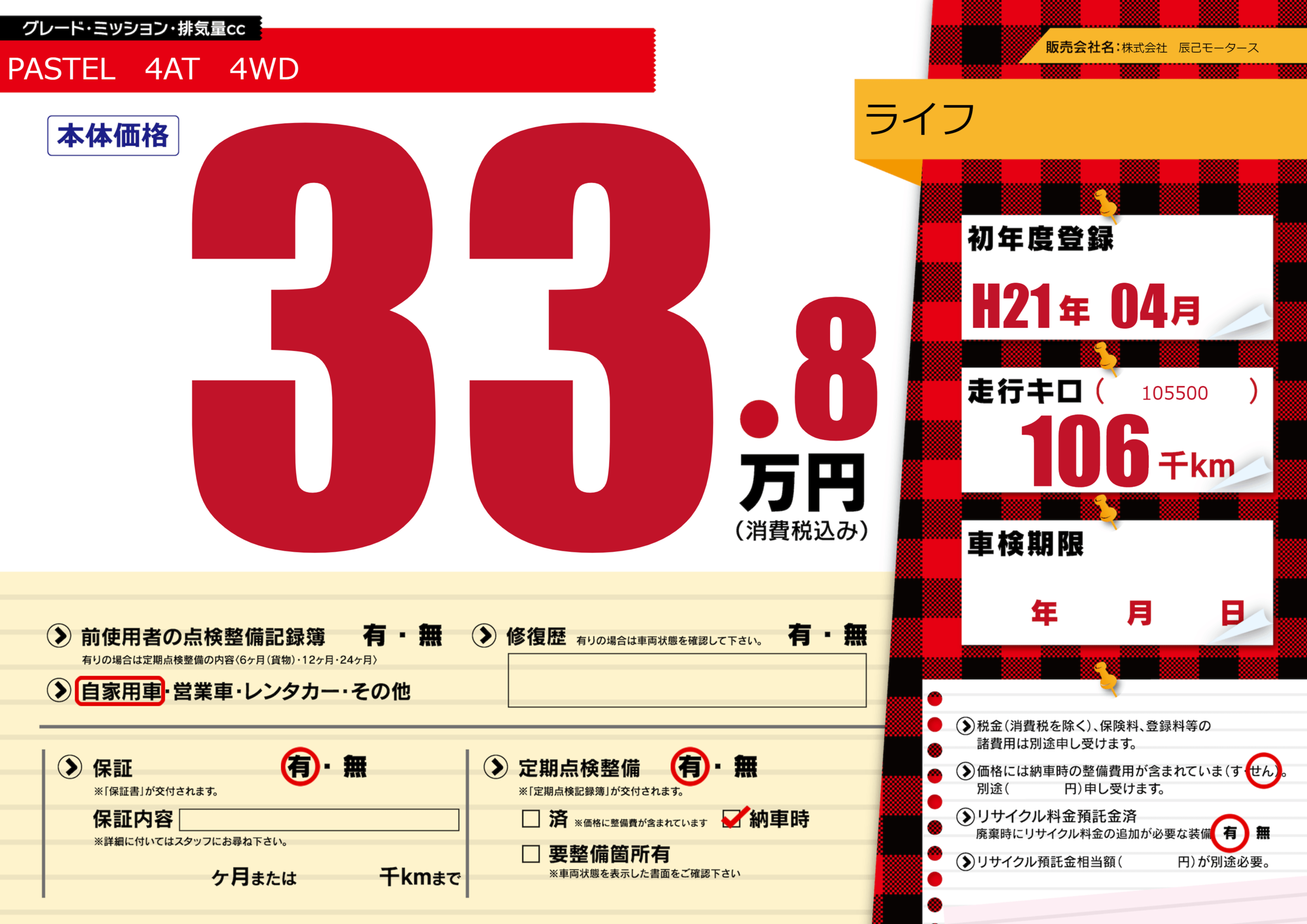 | 走行キロ | 10.6万km | 初年度登録 | H21年04月 |