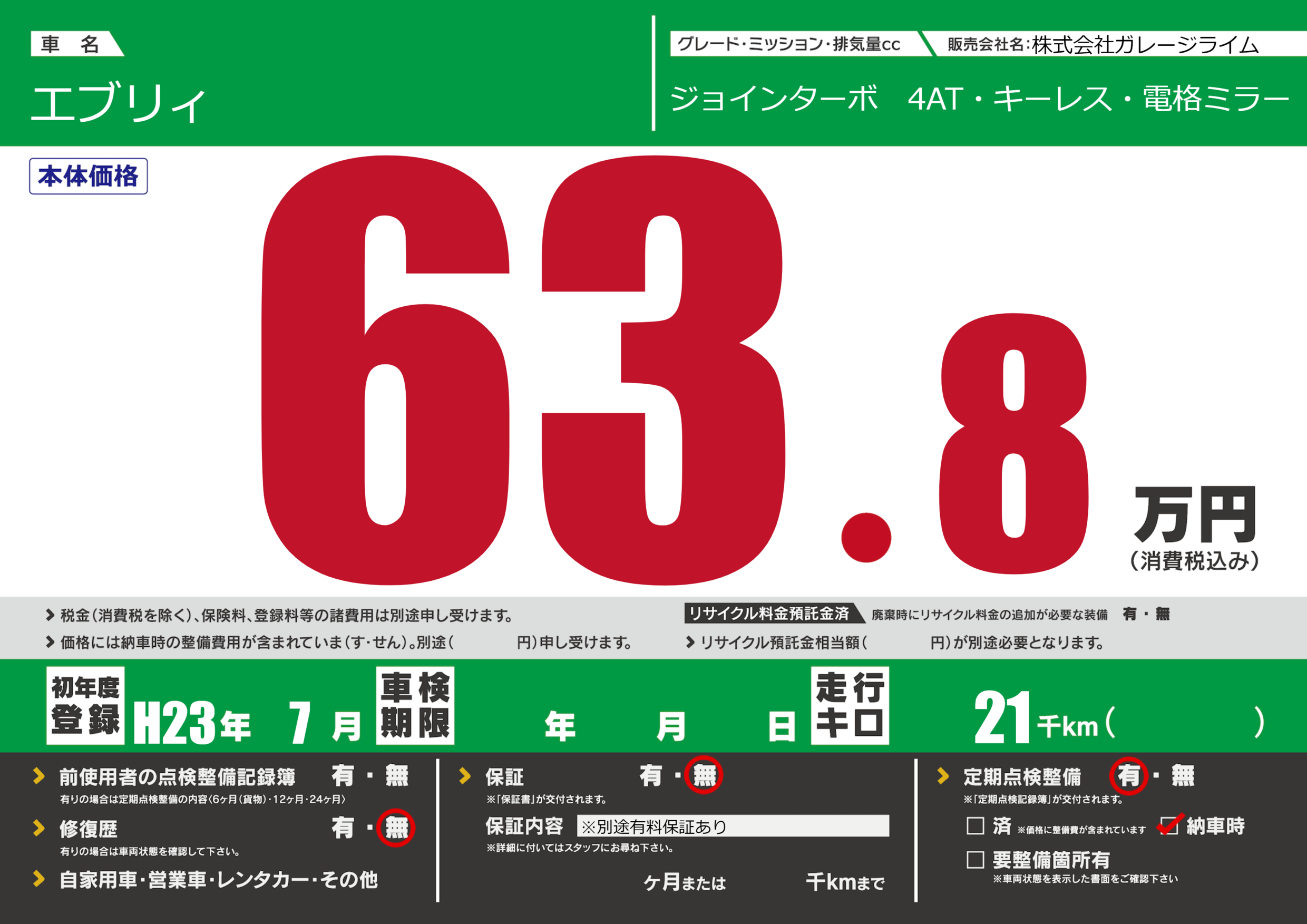 保証なし 保証内容(※別途有料保証あり) ---ヶ月または()千kmまで |
