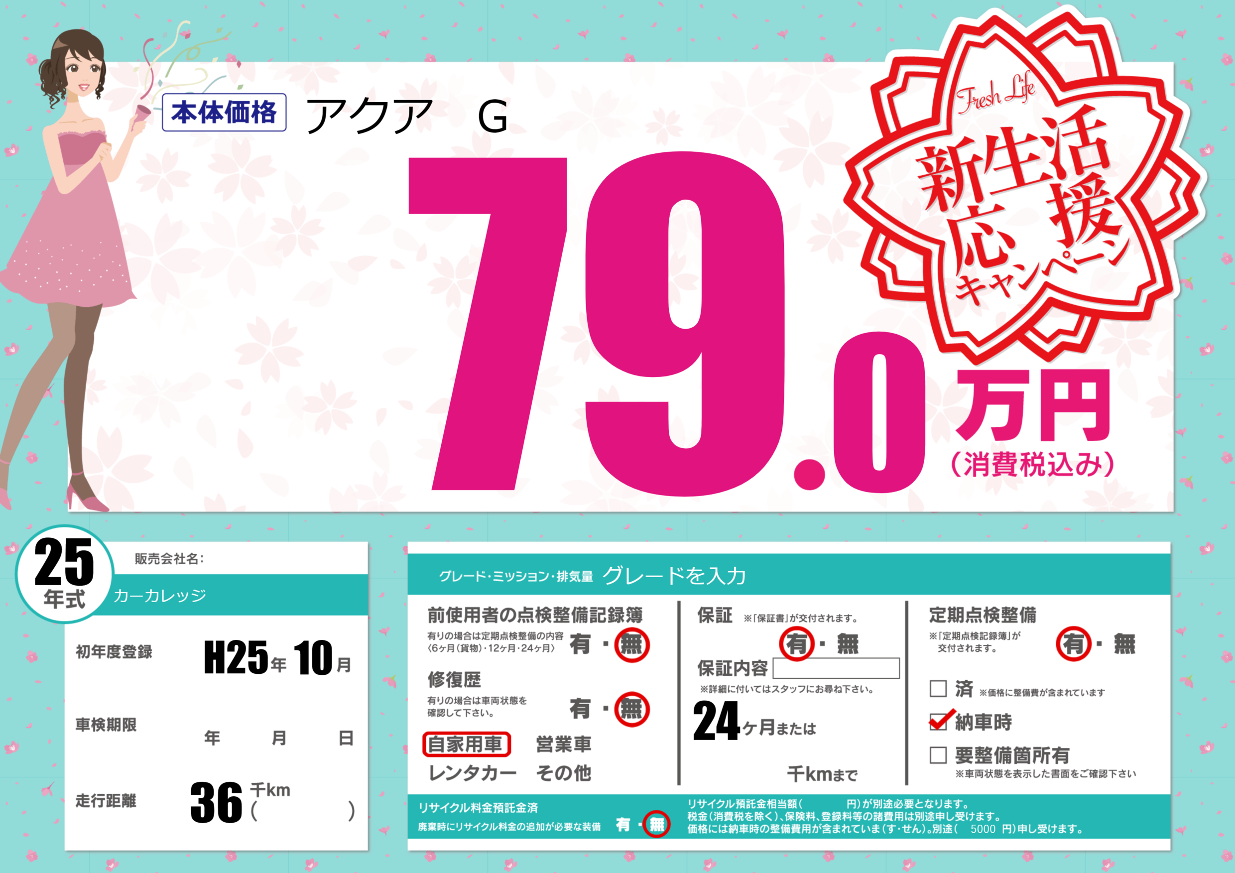 | 車名 | アクア G | グレード ミッション 排気量 |