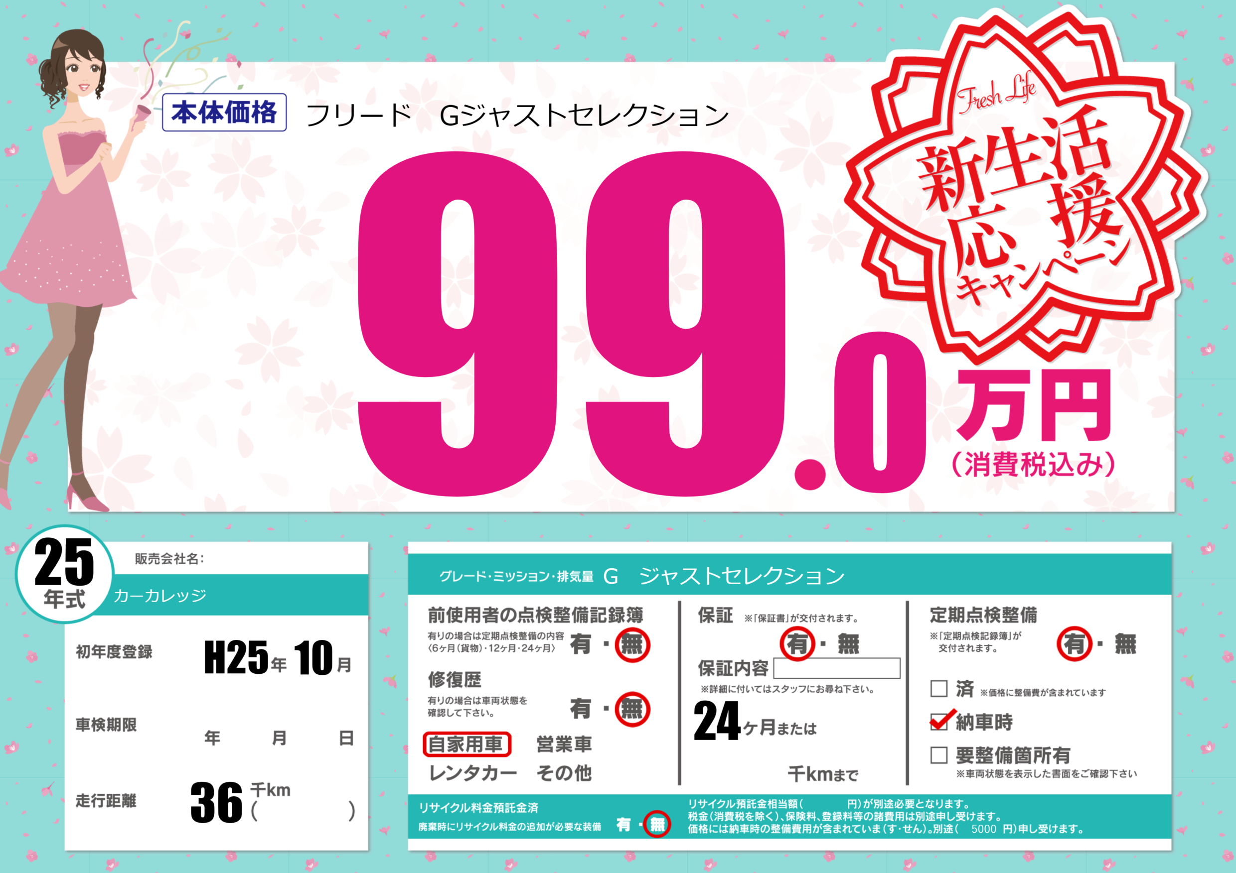 | 車名 | フリード Gジャストセレクション | グレード ミッション 排気量 |