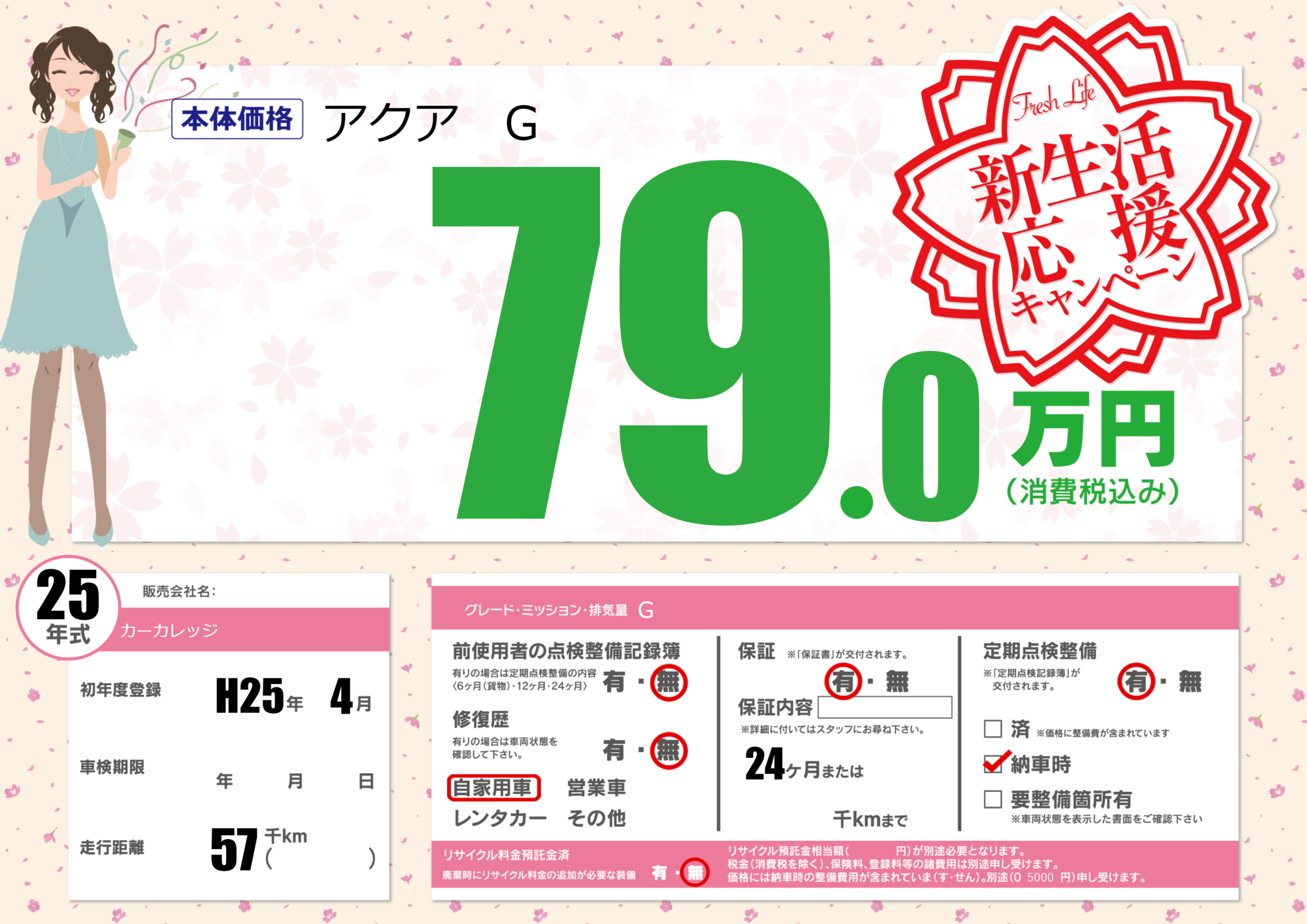| 車名 | アクア G | グレード ミッション 排気量 |