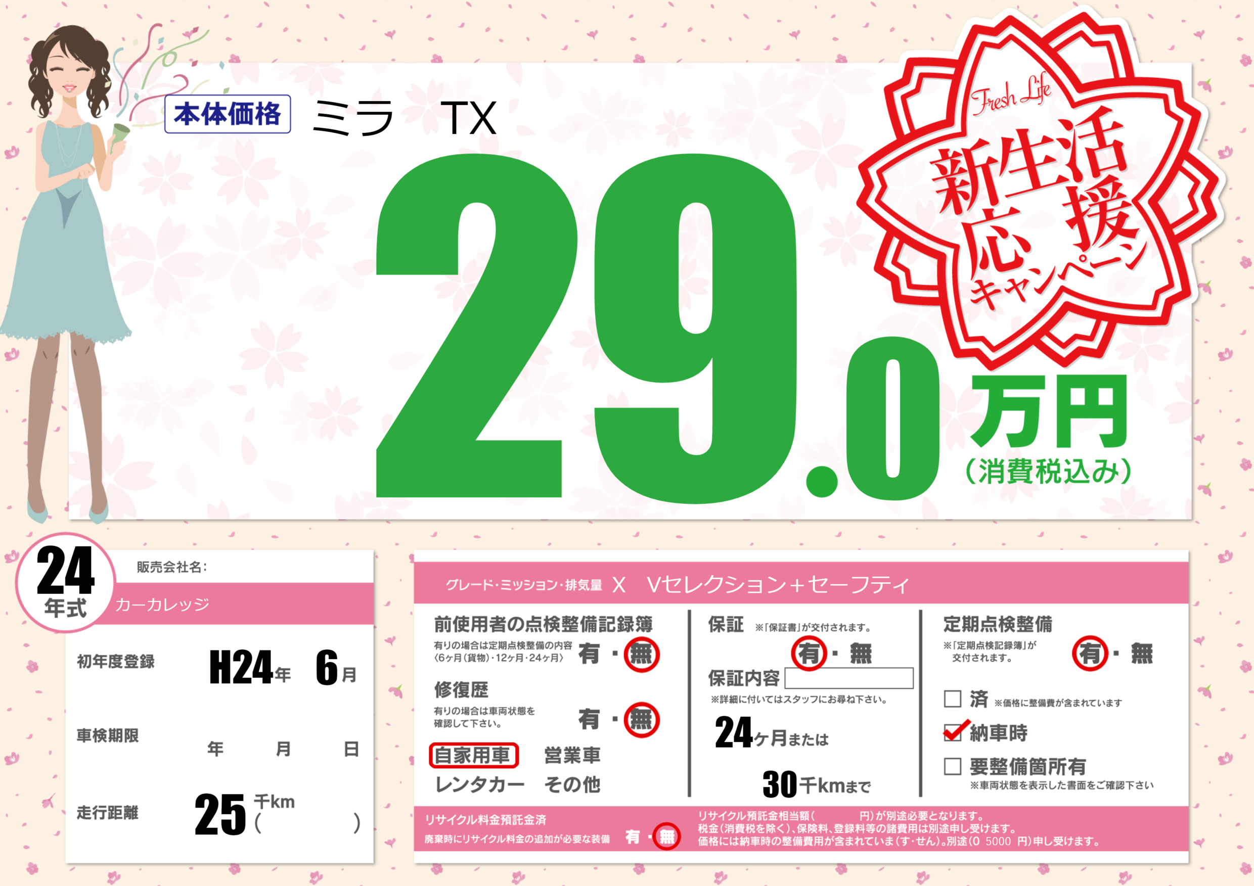 保証付き 保証内容(---) 24ヶ月または(30)千kmまで |