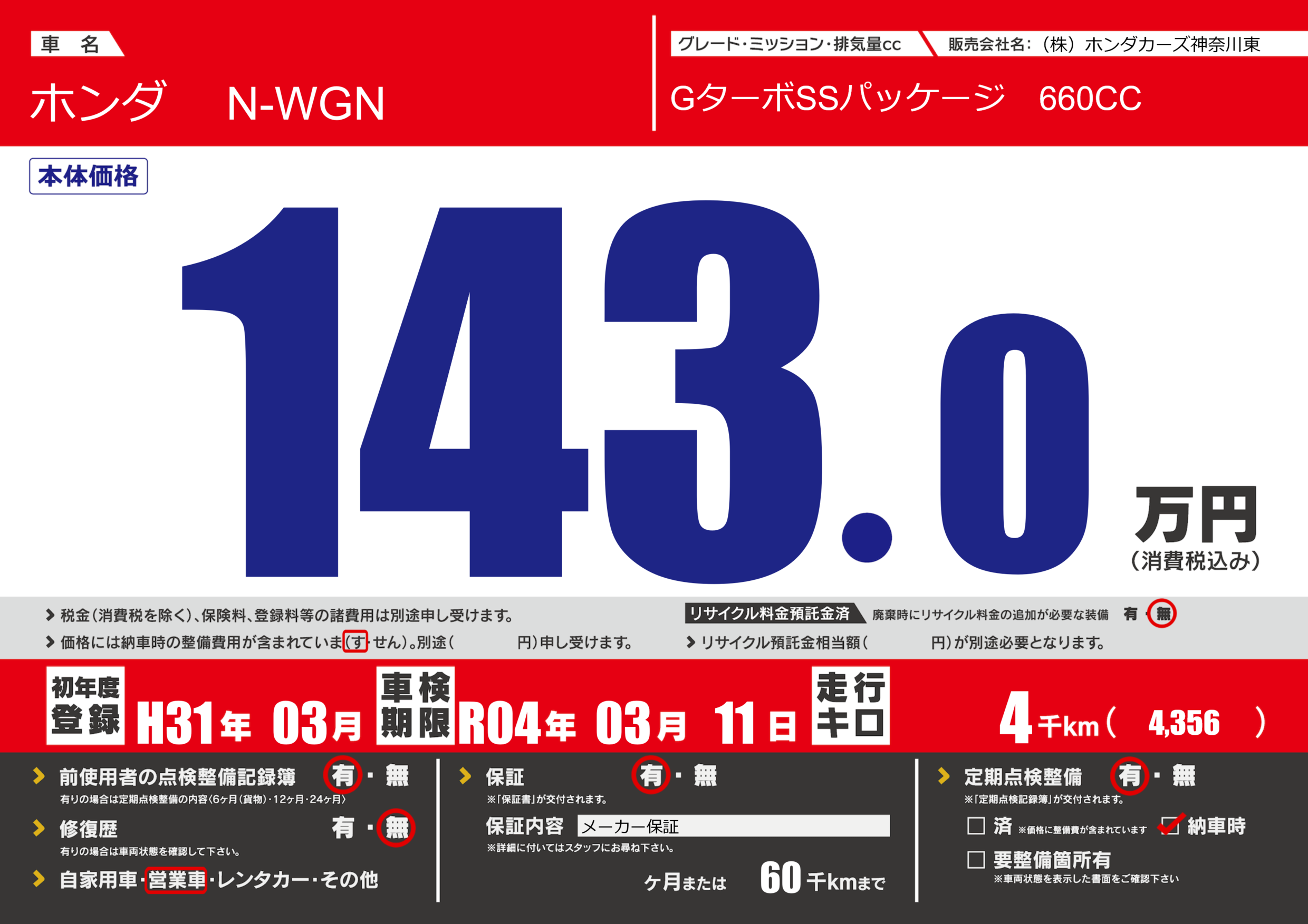| 車名 | ホンダ N-WGN | グレード ミッション 排気量 |