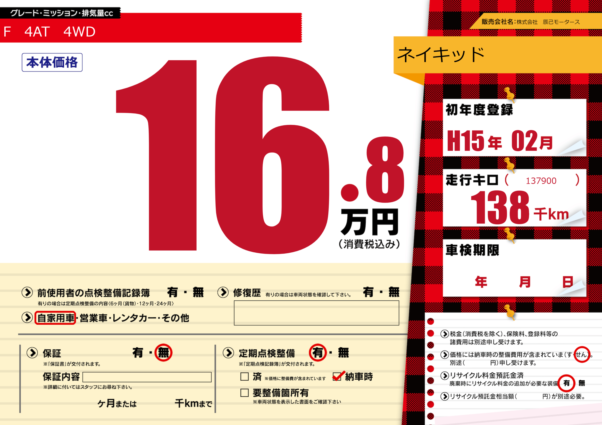 | 走行キロ | 13.8万km | 初年度登録 | H15年02月 |