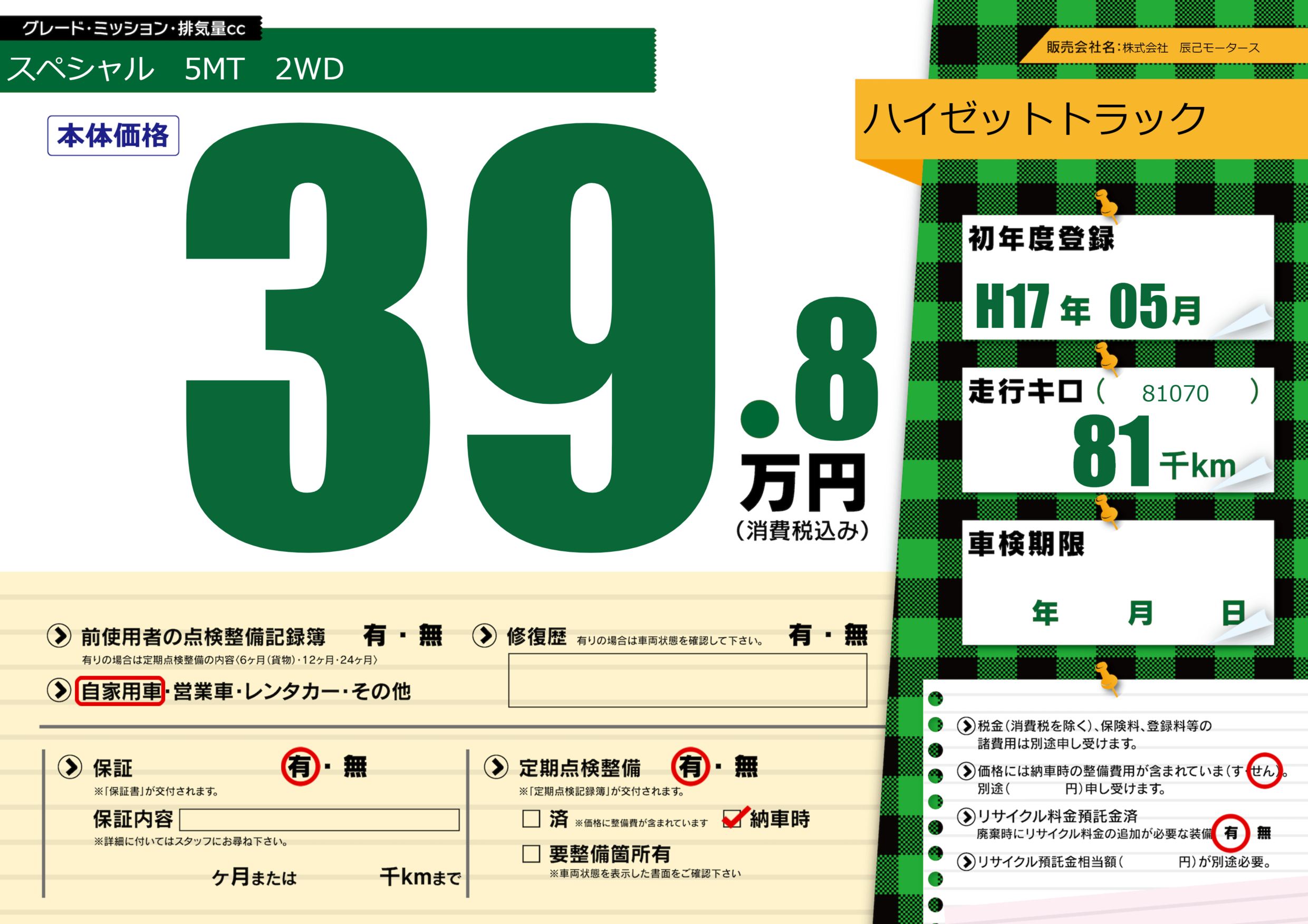 | 定期点検整備 | 定期点検整備あり 納車時あり | ||
