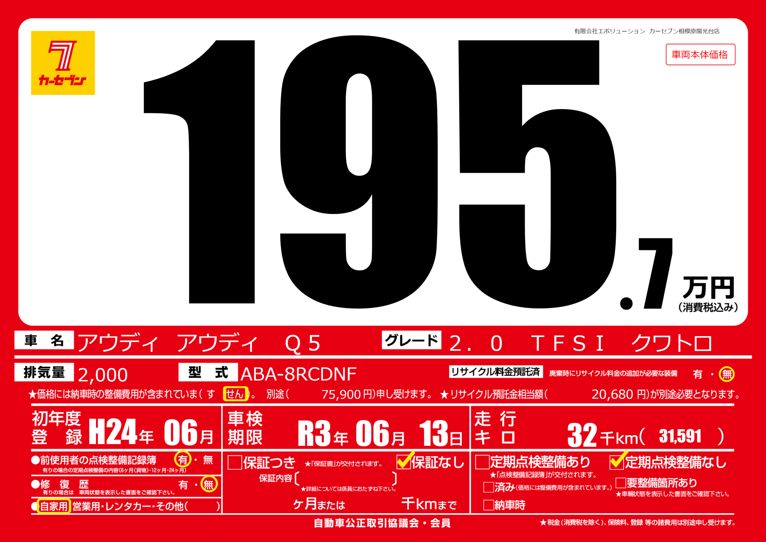| 走行キロ | 3.2万km | 初年度登録 | H24年06月 |