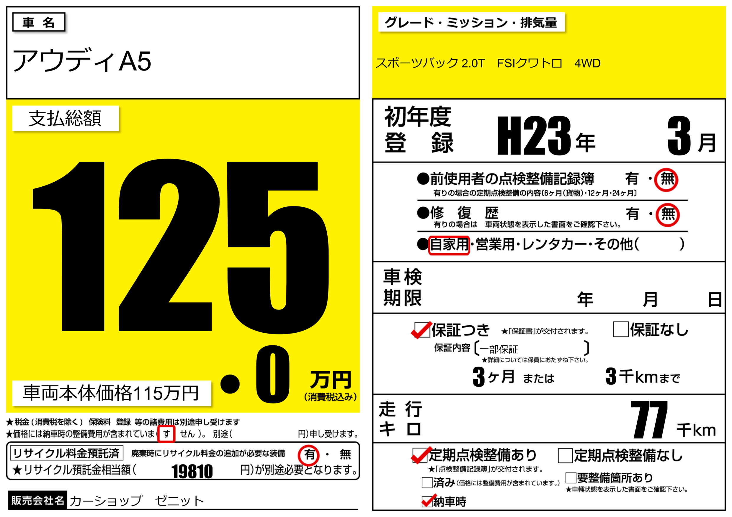 | 車名 | アウディA5 | グレード ミッション 排気量 |