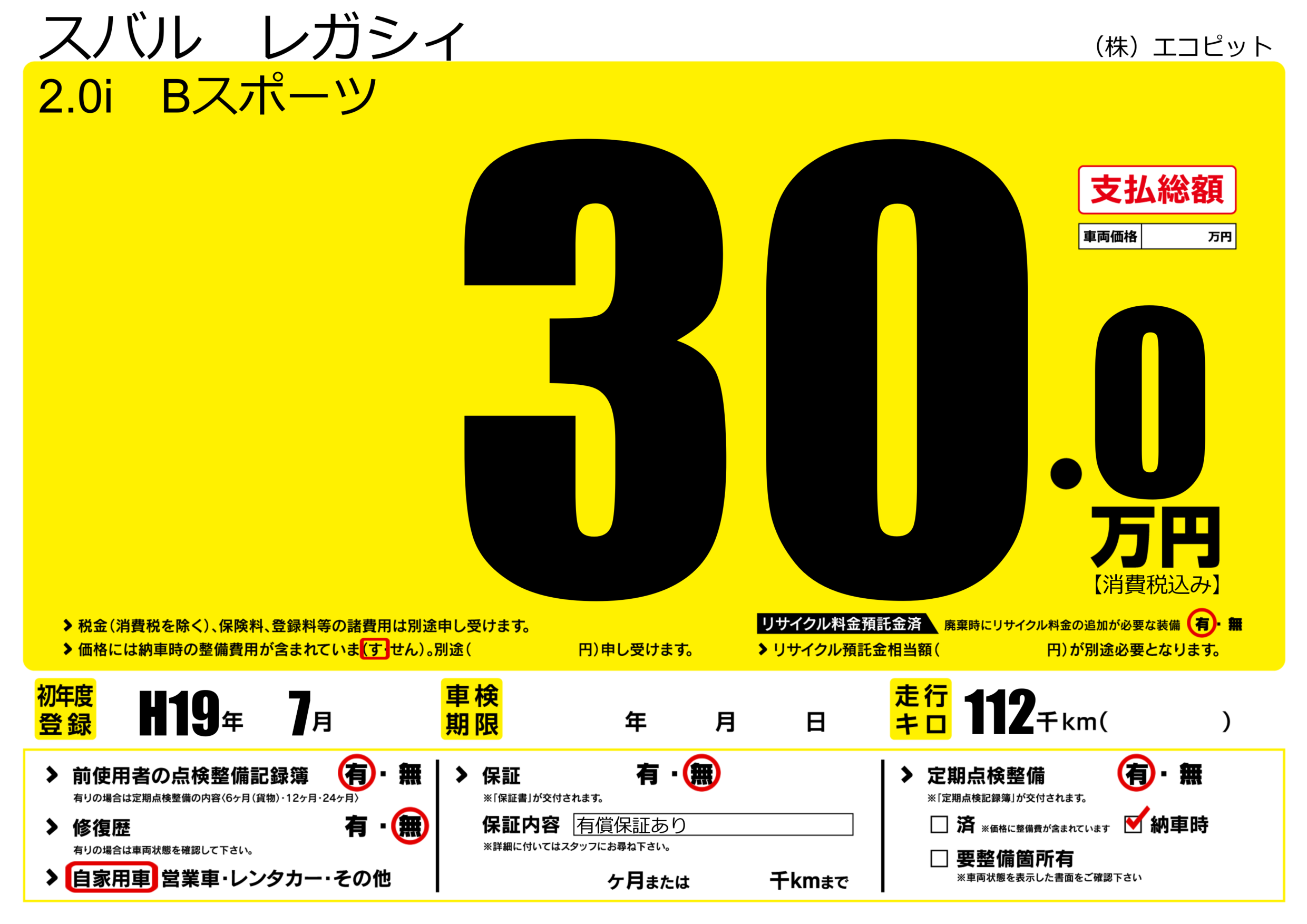 | 車名 | スバル レガシィ | グレード ミッション 排気量 |