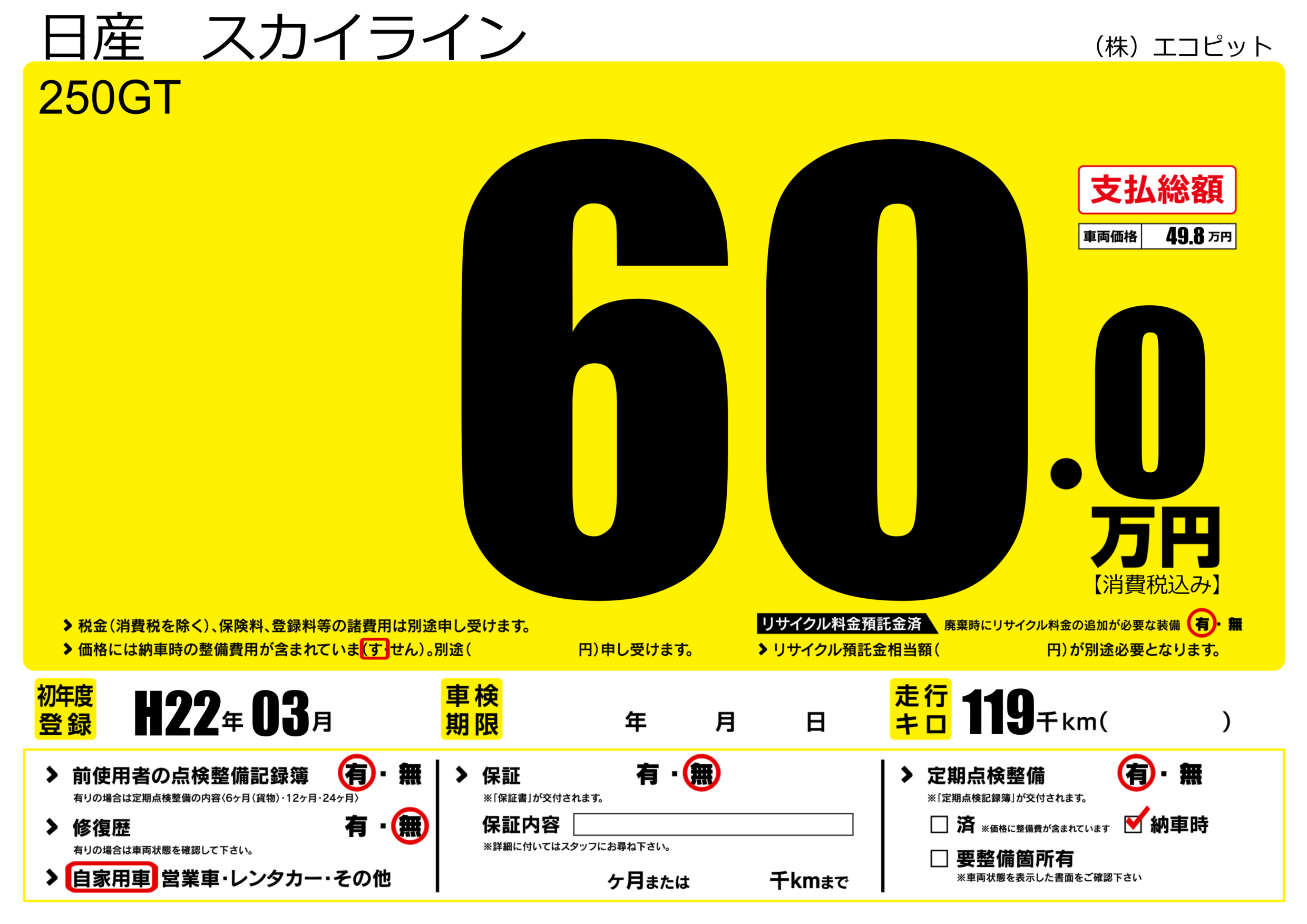 | 車名 | 日産 スカイライン | グレード ミッション 排気量 |