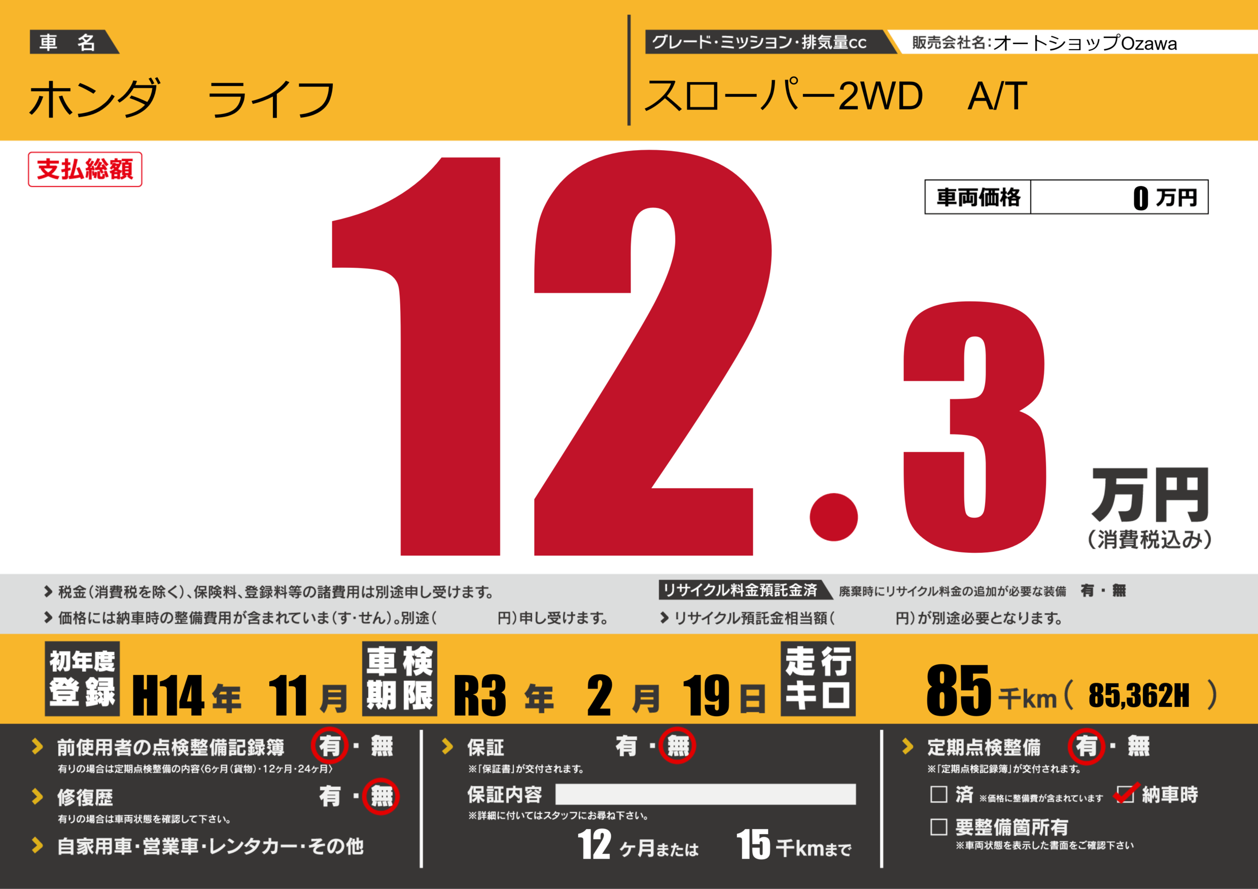 保証なし 保証内容(---) 12ヶ月または(15)千kmまで |