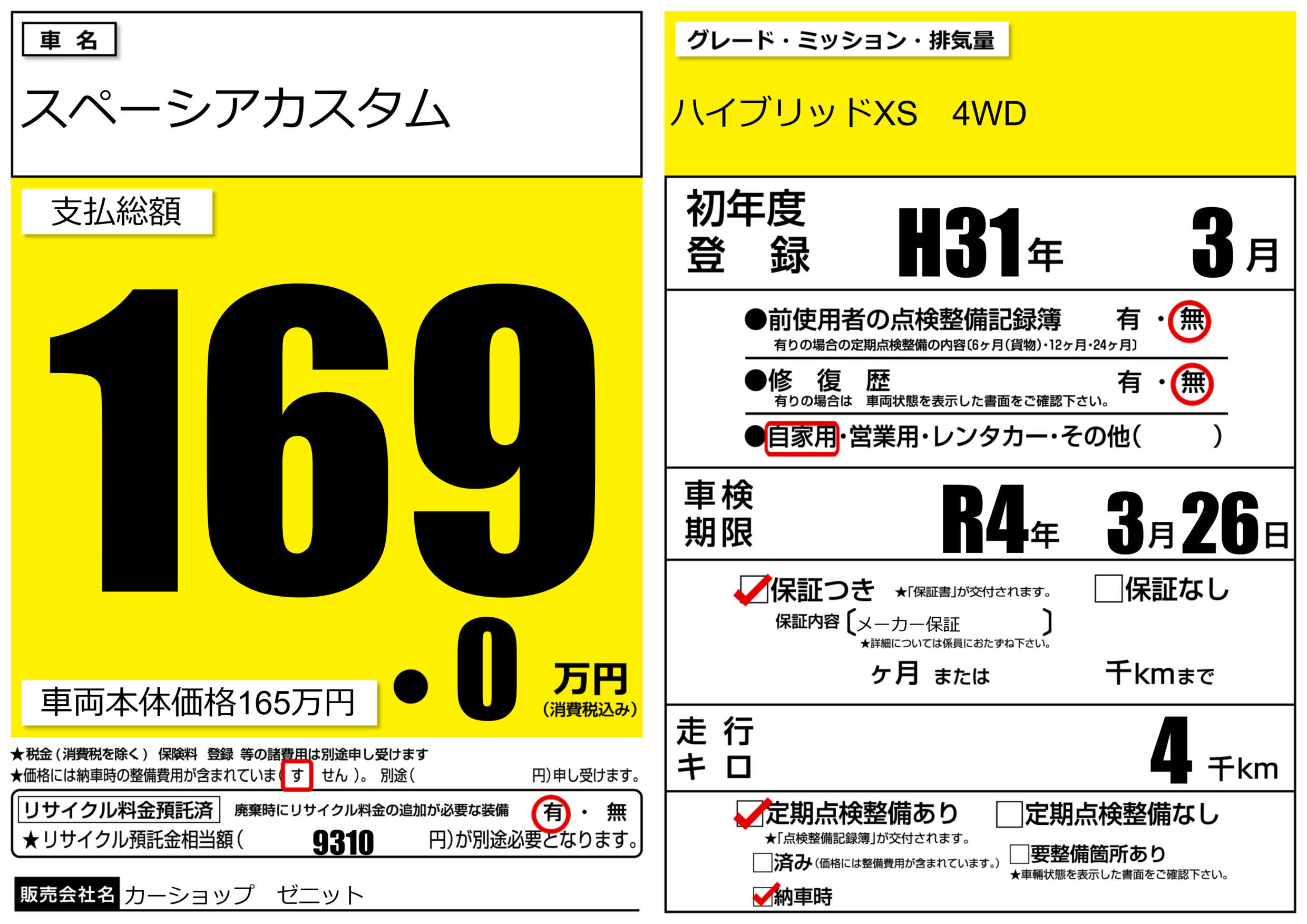 | 車名 | スペーシアカスタム | グレード ミッション 排気量 |