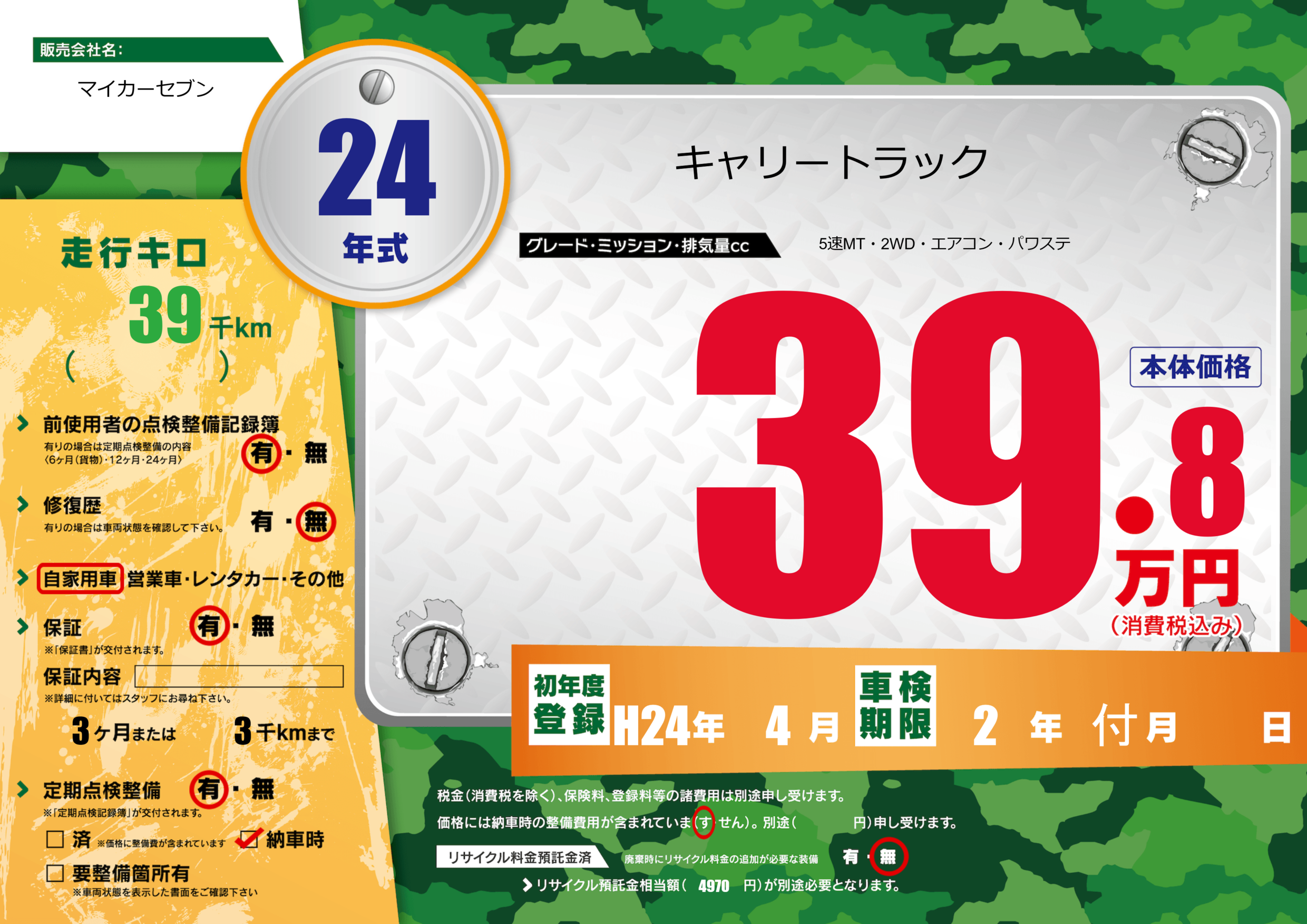 | 車名 | キャリートラック | グレード ミッション 排気量 |