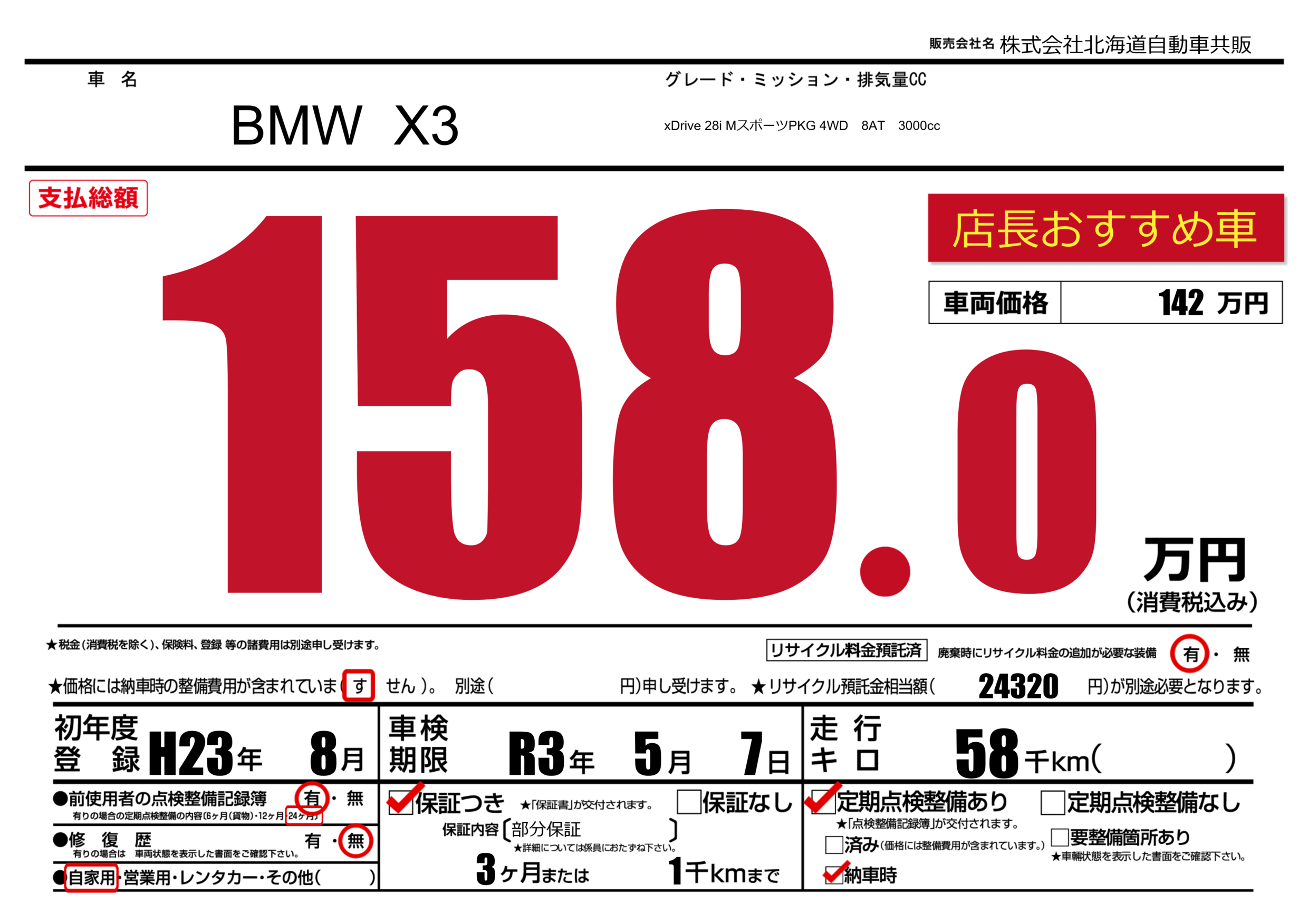 | 車名 | BMW X3 | グレード ミッション 排気量 |