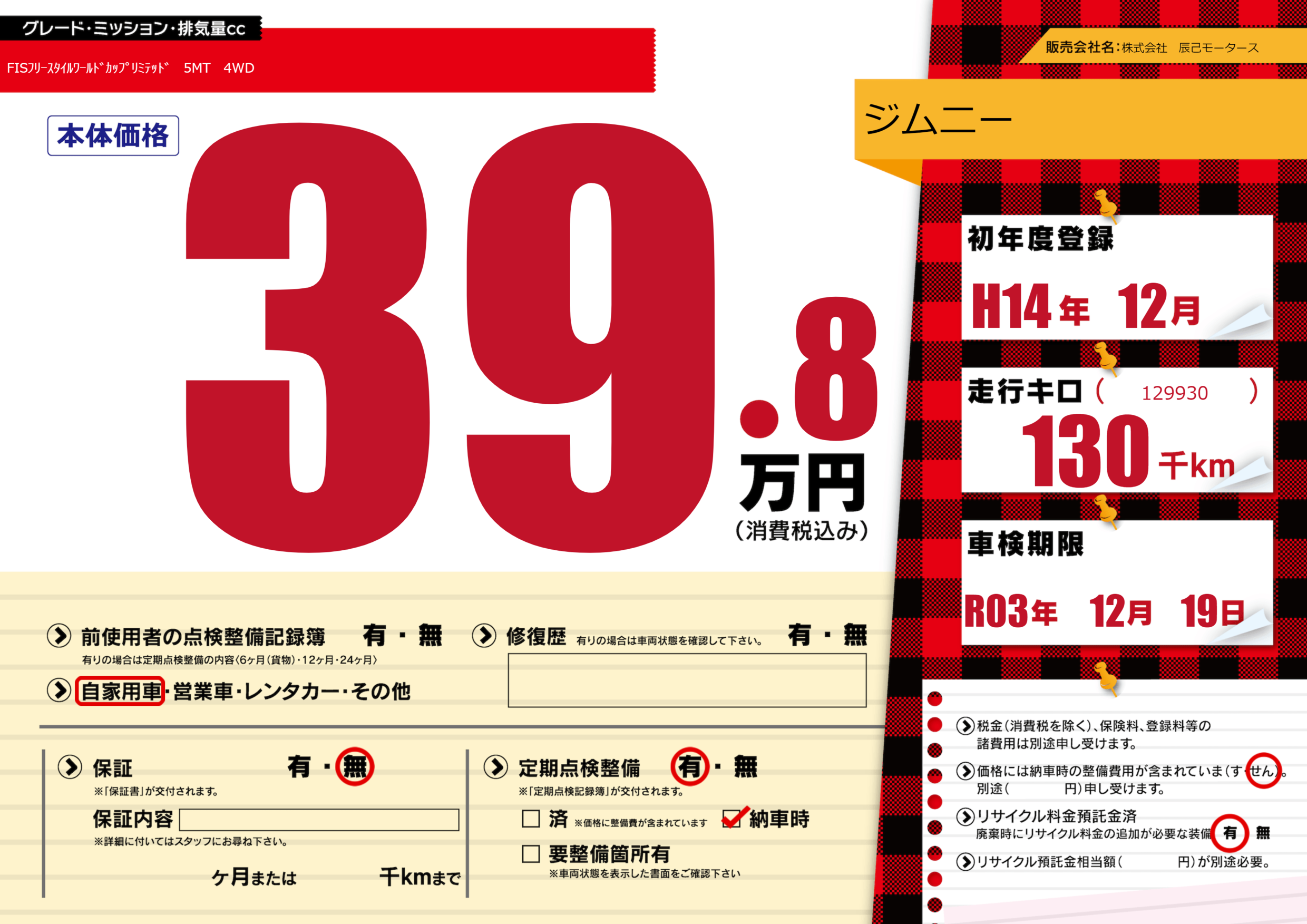 あり | 車検制限 | R03年12月19月 |
