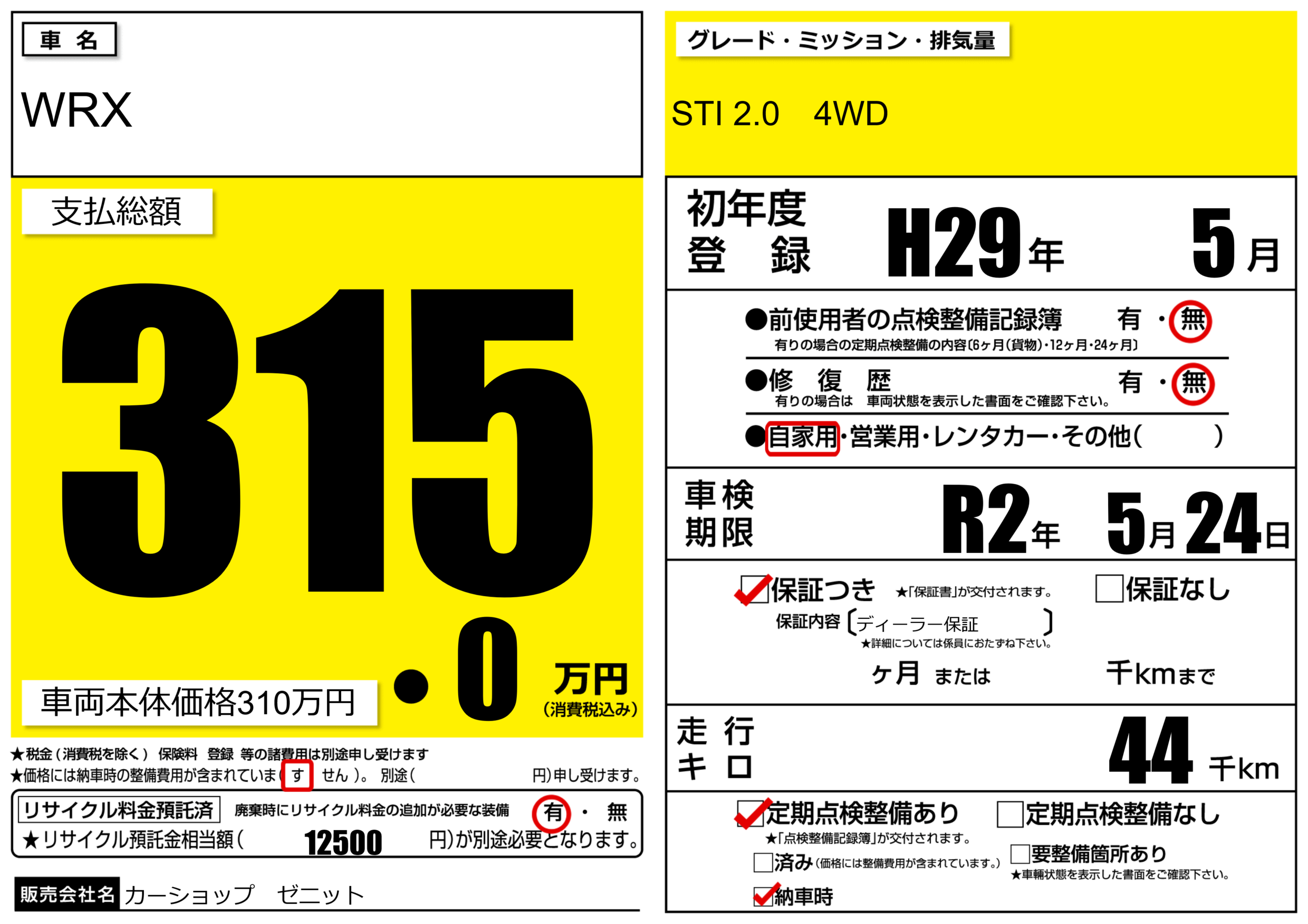 | 車名 | WRX | グレード ミッション 排気量 |