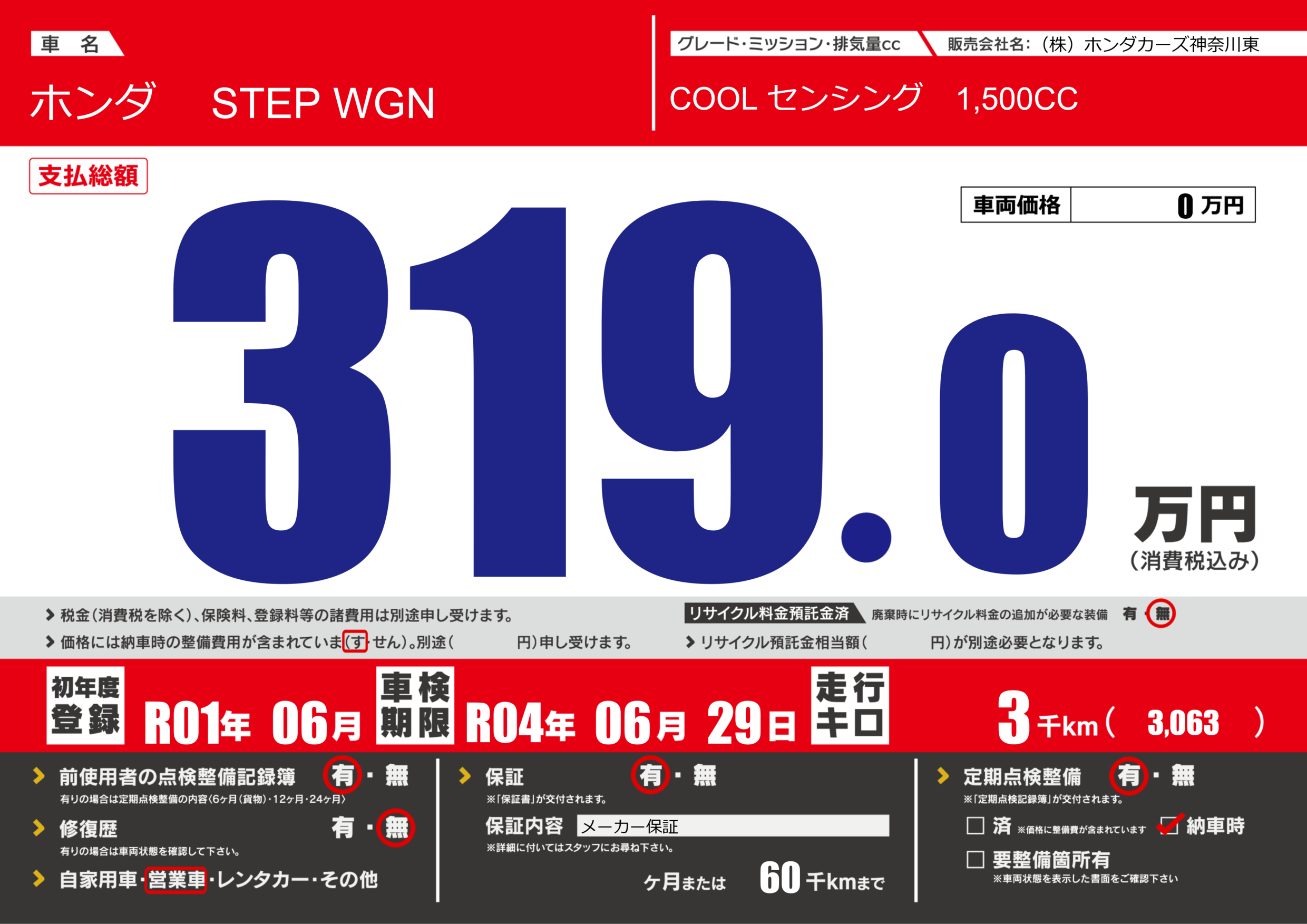 | 車名 | ホンダ STEP WGN | グレード ミッション 排気量 |