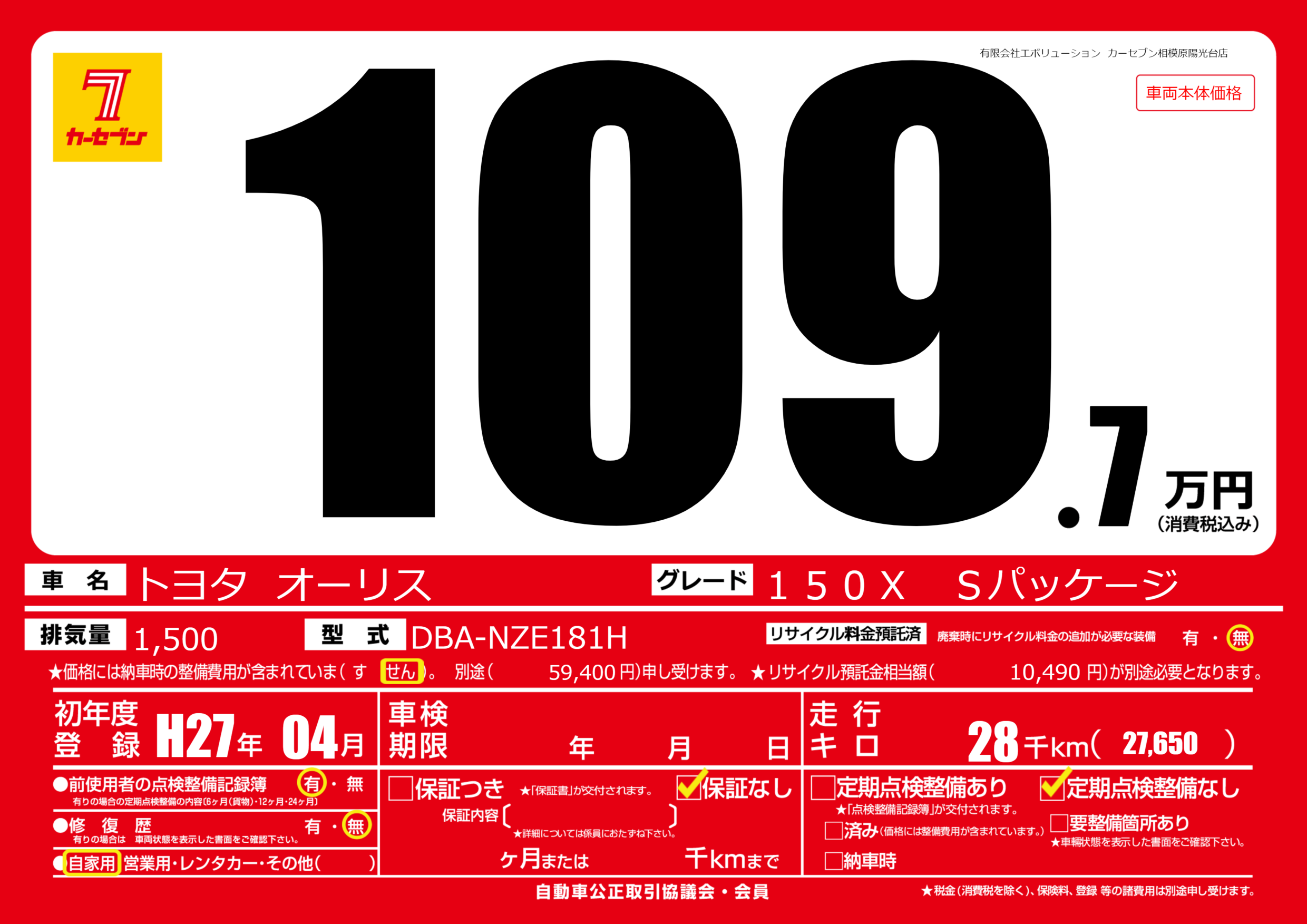 | 車名 | トヨタ オーリス | グレード ミッション 排気量 |
