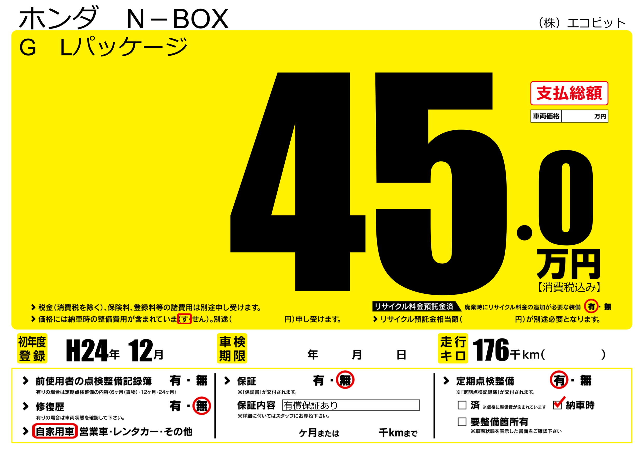保証なし 保証内容(有償保証あり) ---ヶ月または()千kmまで |