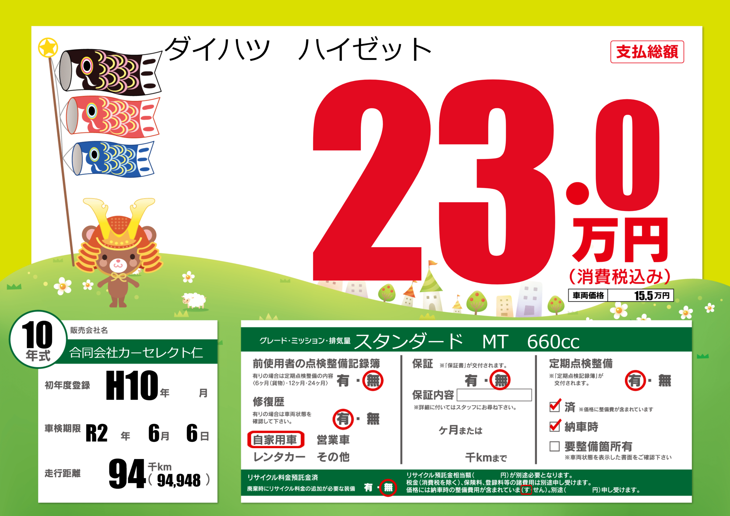 | 定期点検整備 | 定期点検整備あり 定期点検整備済み 納車時あり | ||