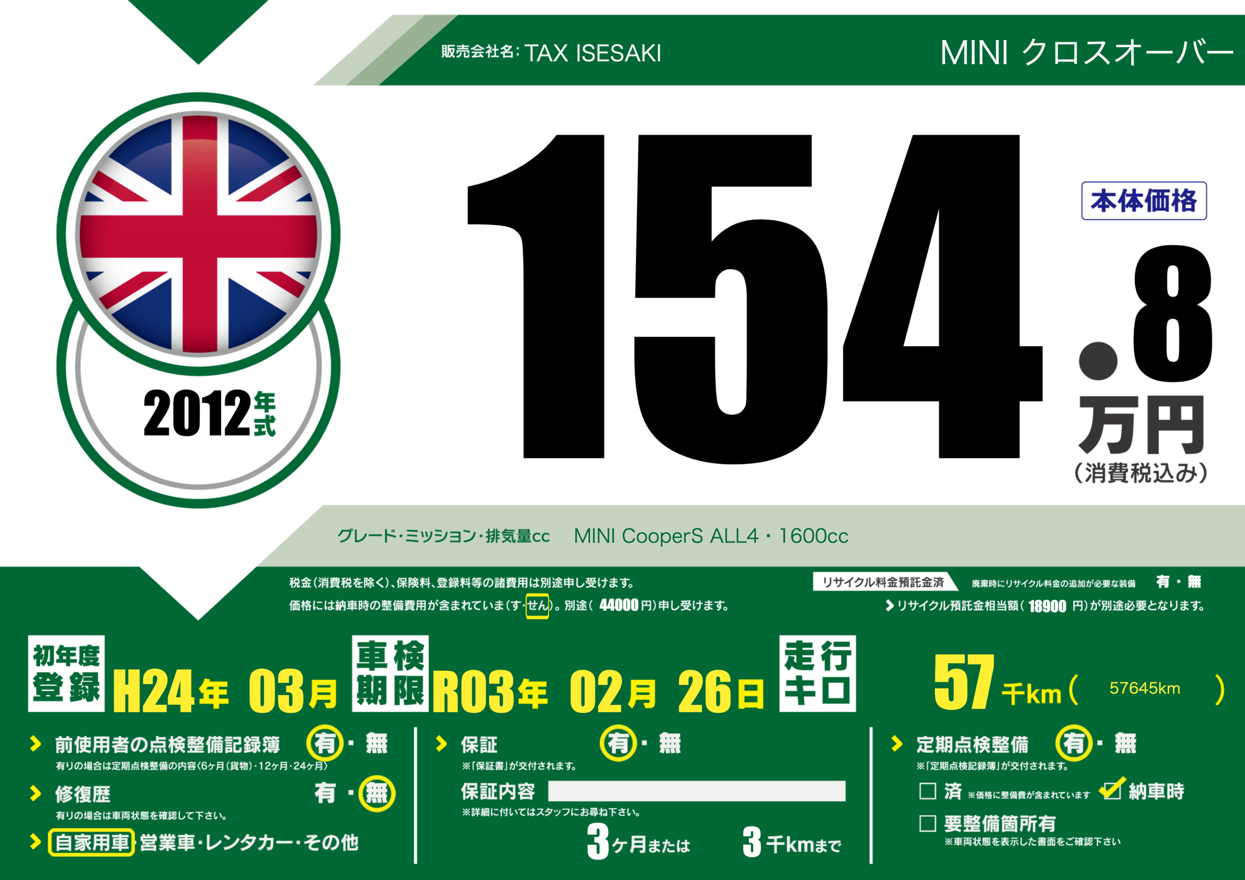 | 車名 | MINI クロスオーバー | グレード ミッション 排気量 |