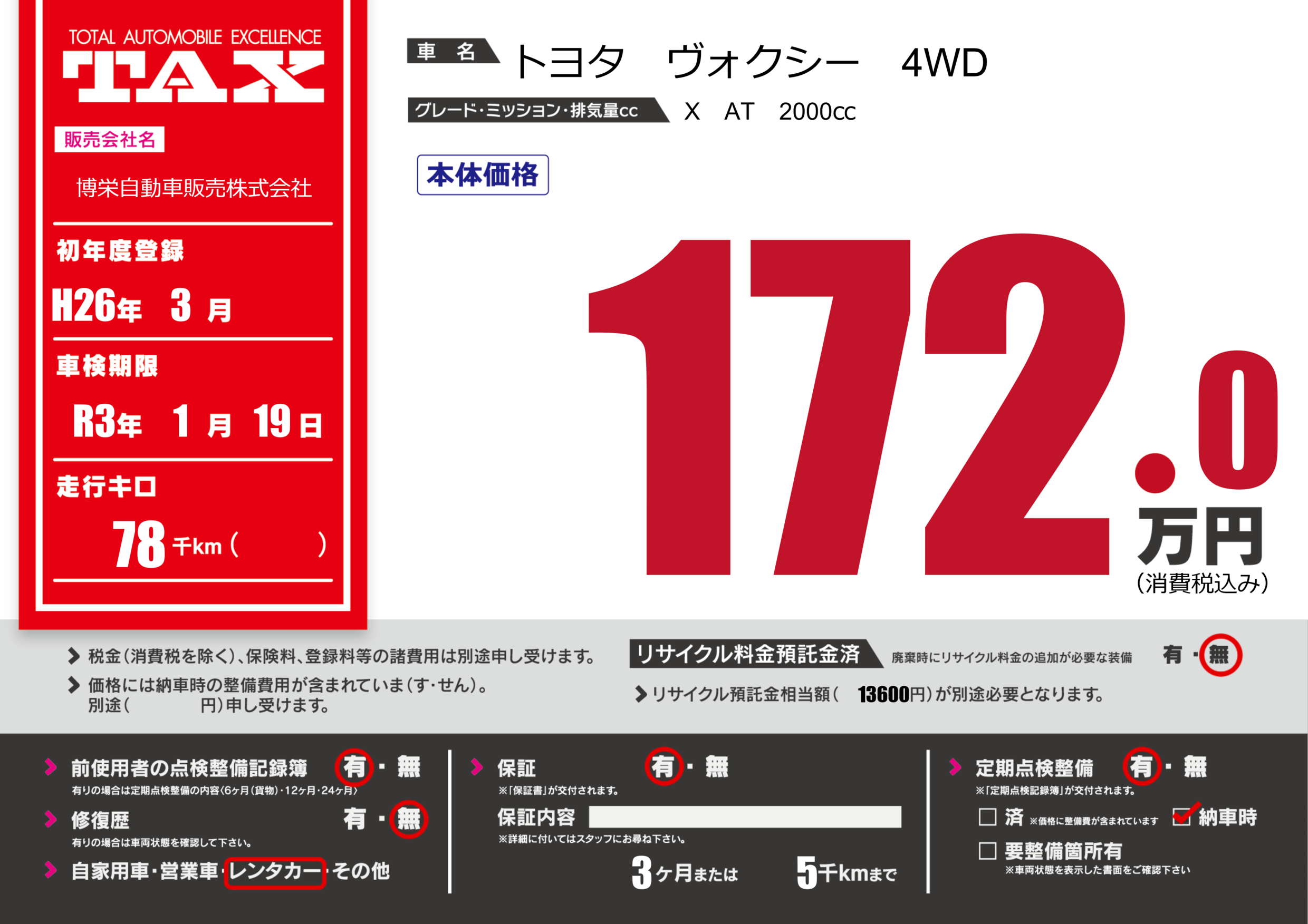 | 車名 | トヨタ ヴォクシー 4WD | グレード ミッション 排気量 |
