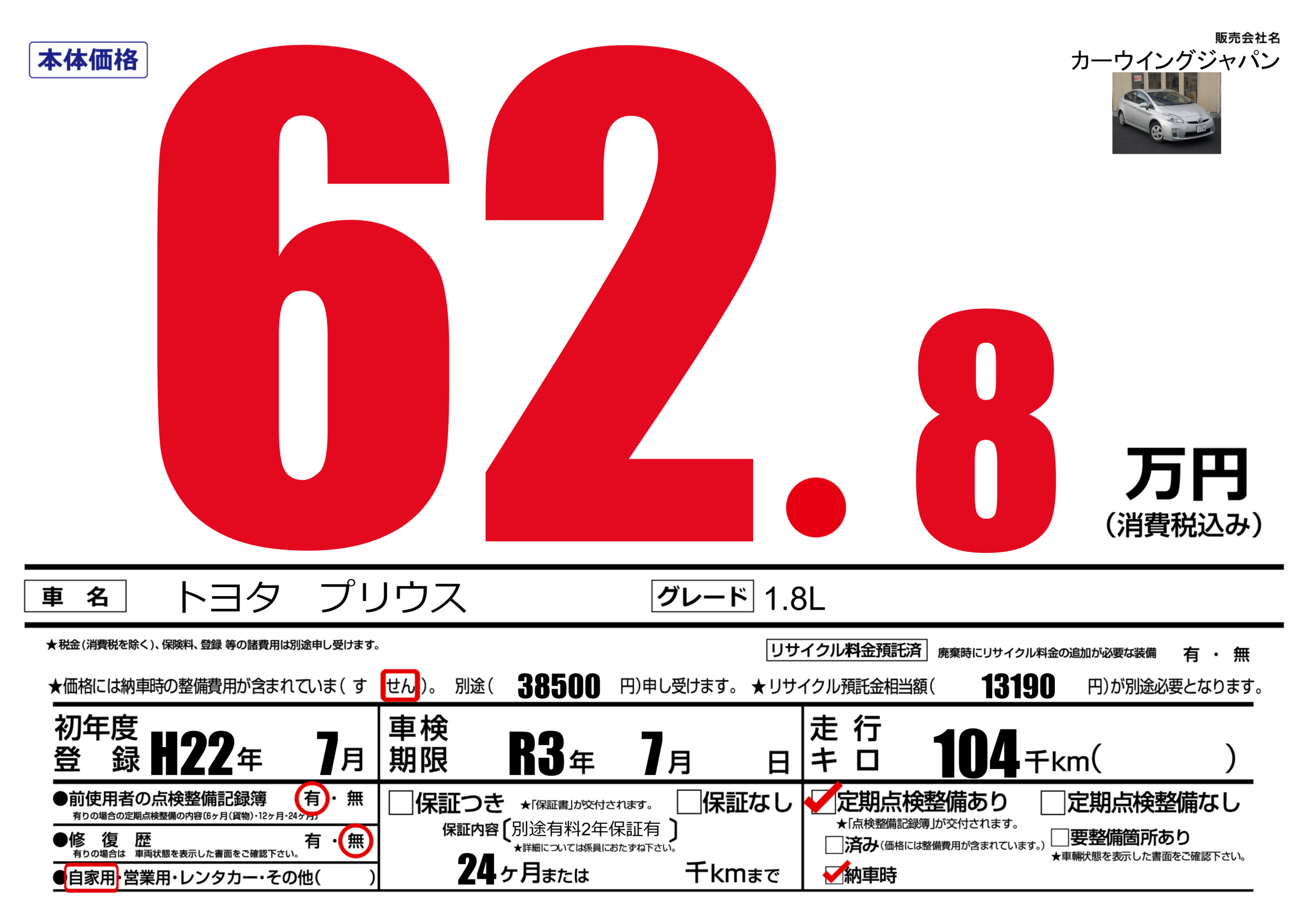 | 車名 | トヨタ プリウス | グレード ミッション 排気量 |