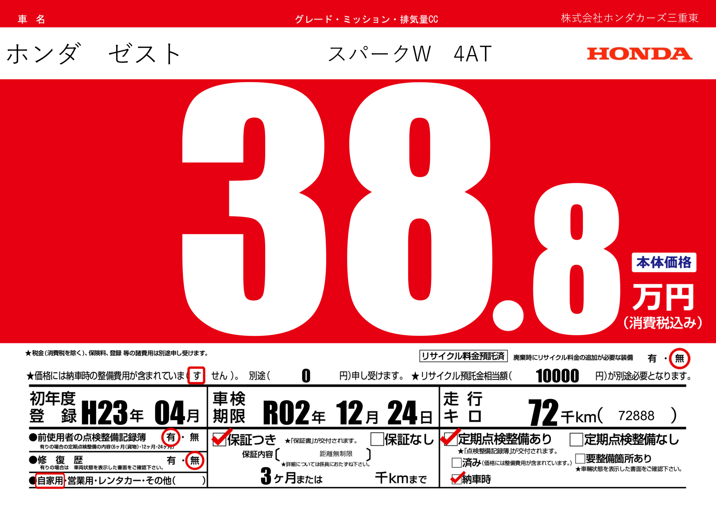 | 車名 | ホンダ ゼスト | グレード ミッション 排気量 |