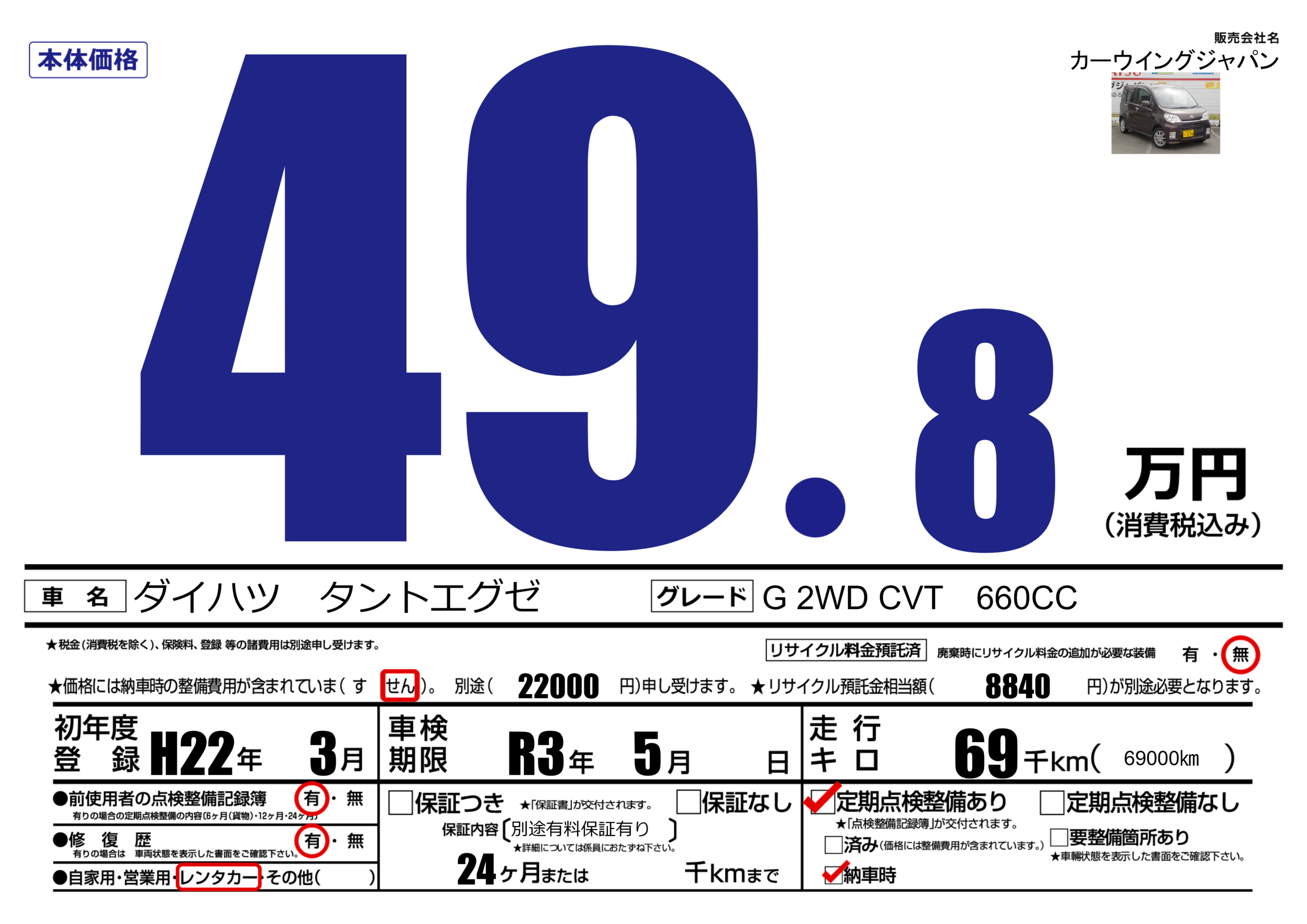 | 車名 | ダイハツ タントエグゼ | グレード ミッション 排気量 |