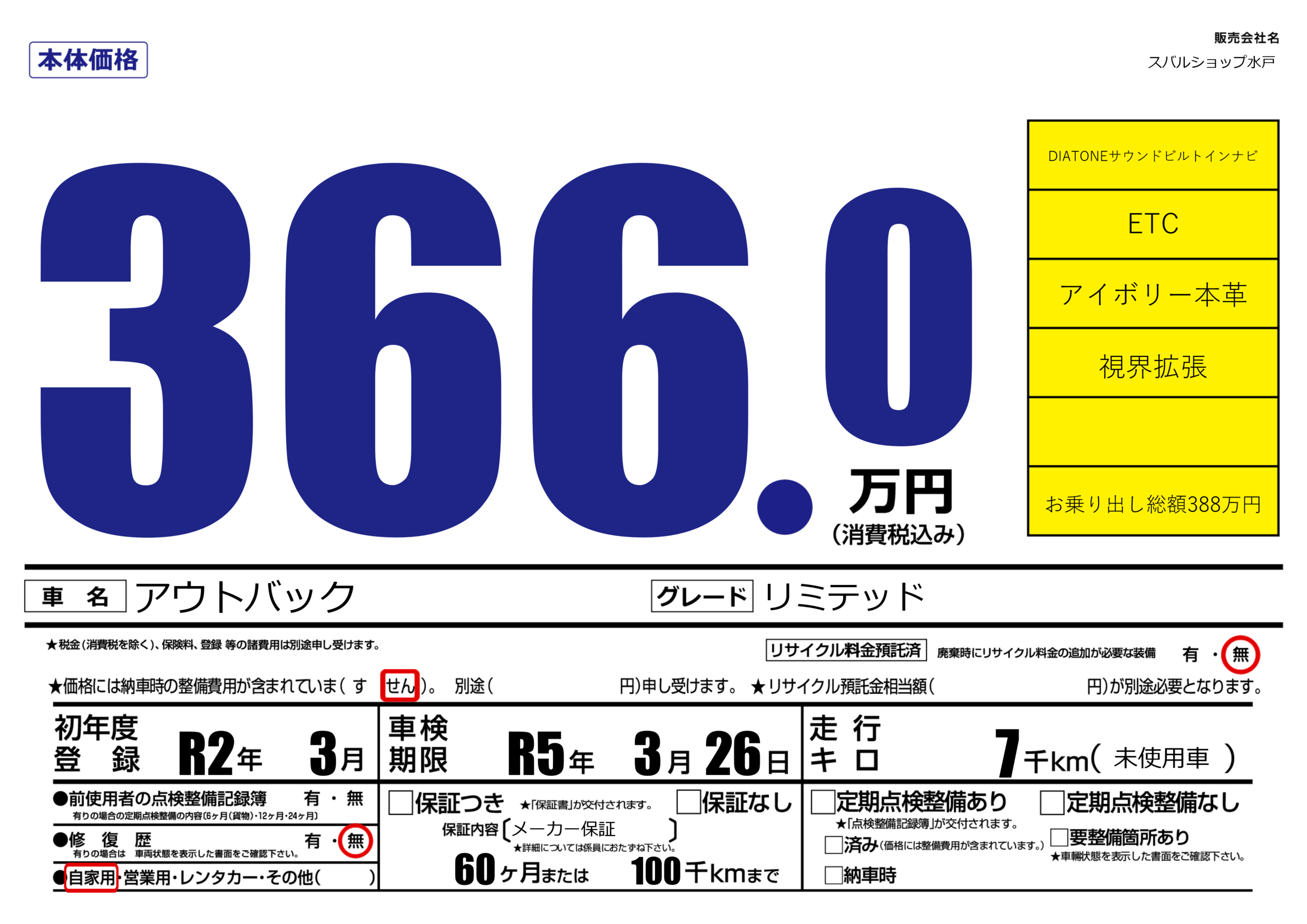 | 車名 | アウトバック | グレード ミッション 排気量 |