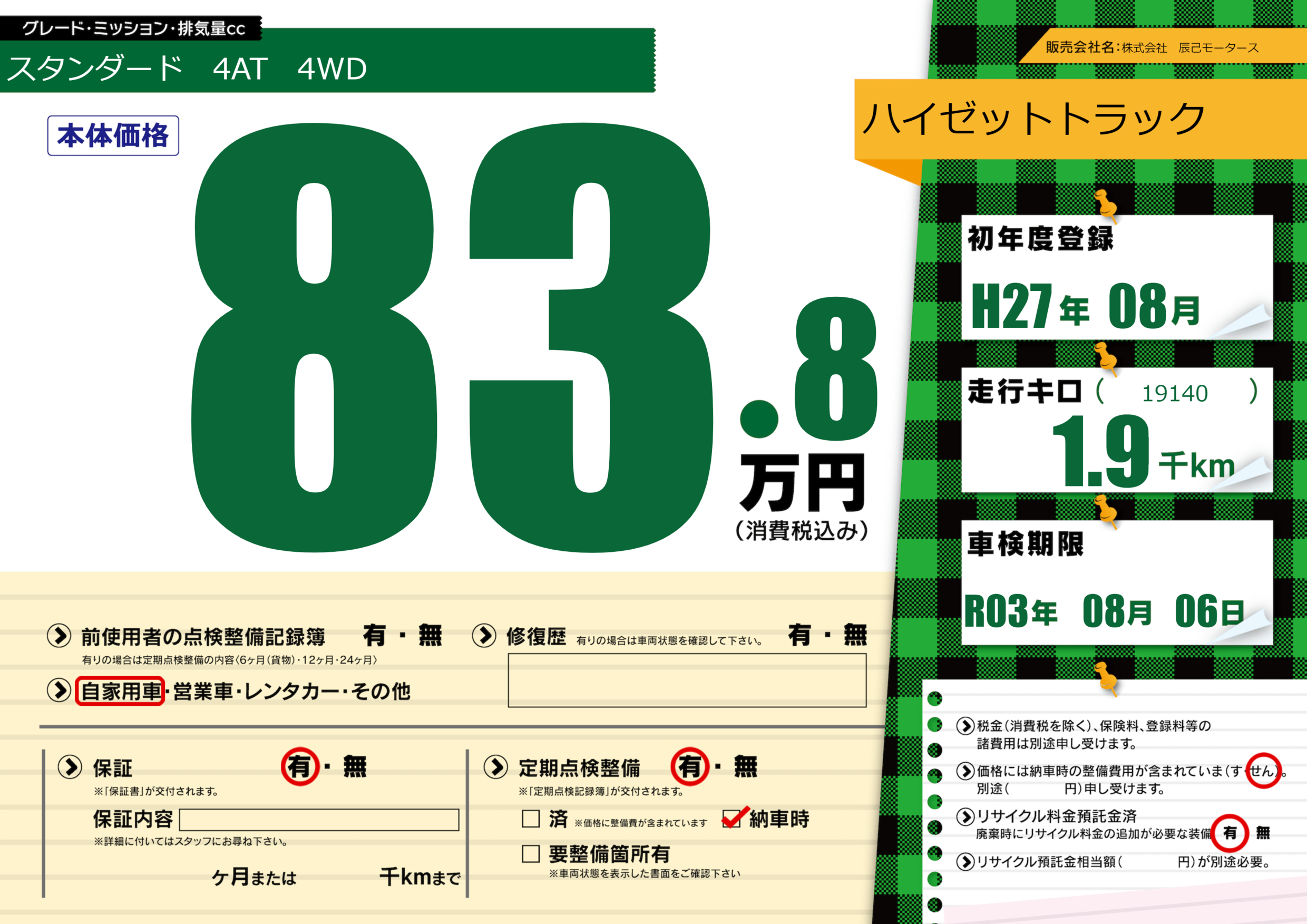 | 車名 | ハイゼットトラック | グレード ミッション 排気量 |