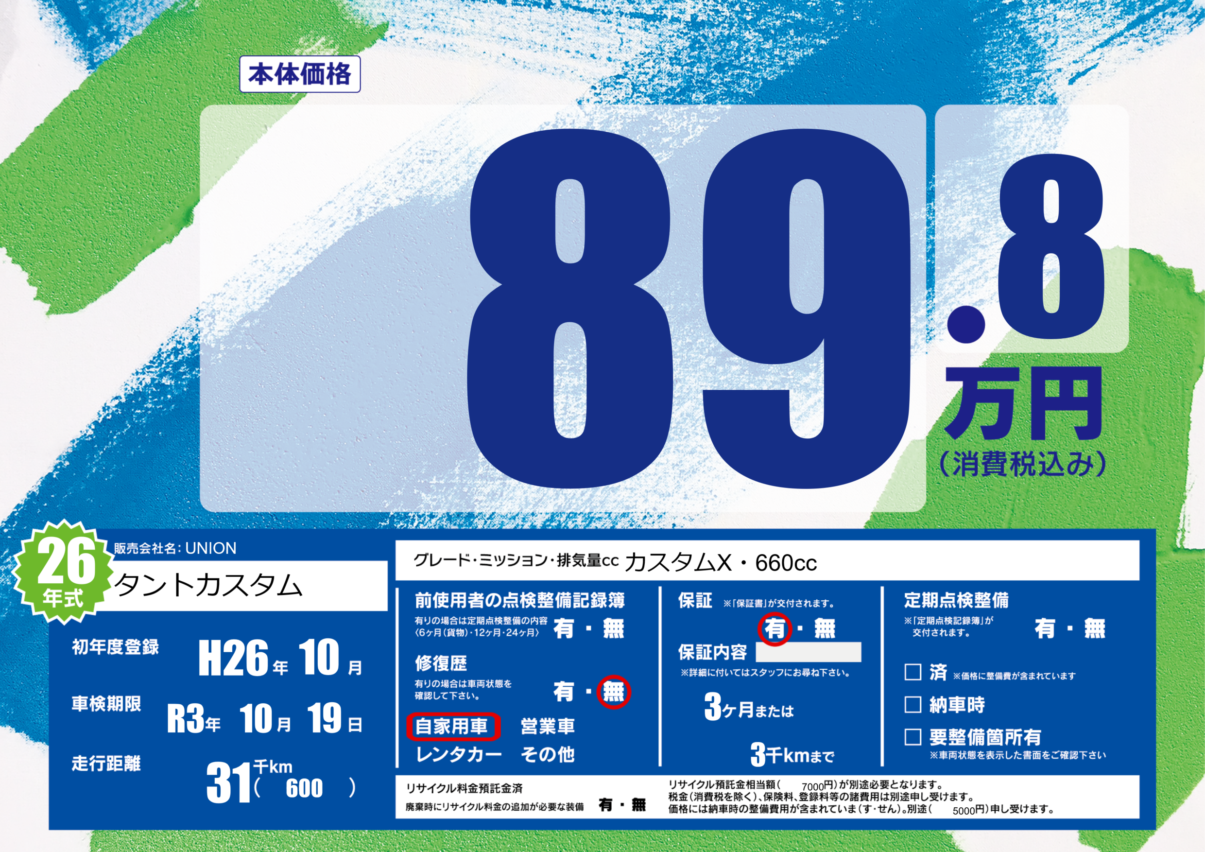 | 走行キロ | 3.1万km | 初年度登録 | H26年10月 |