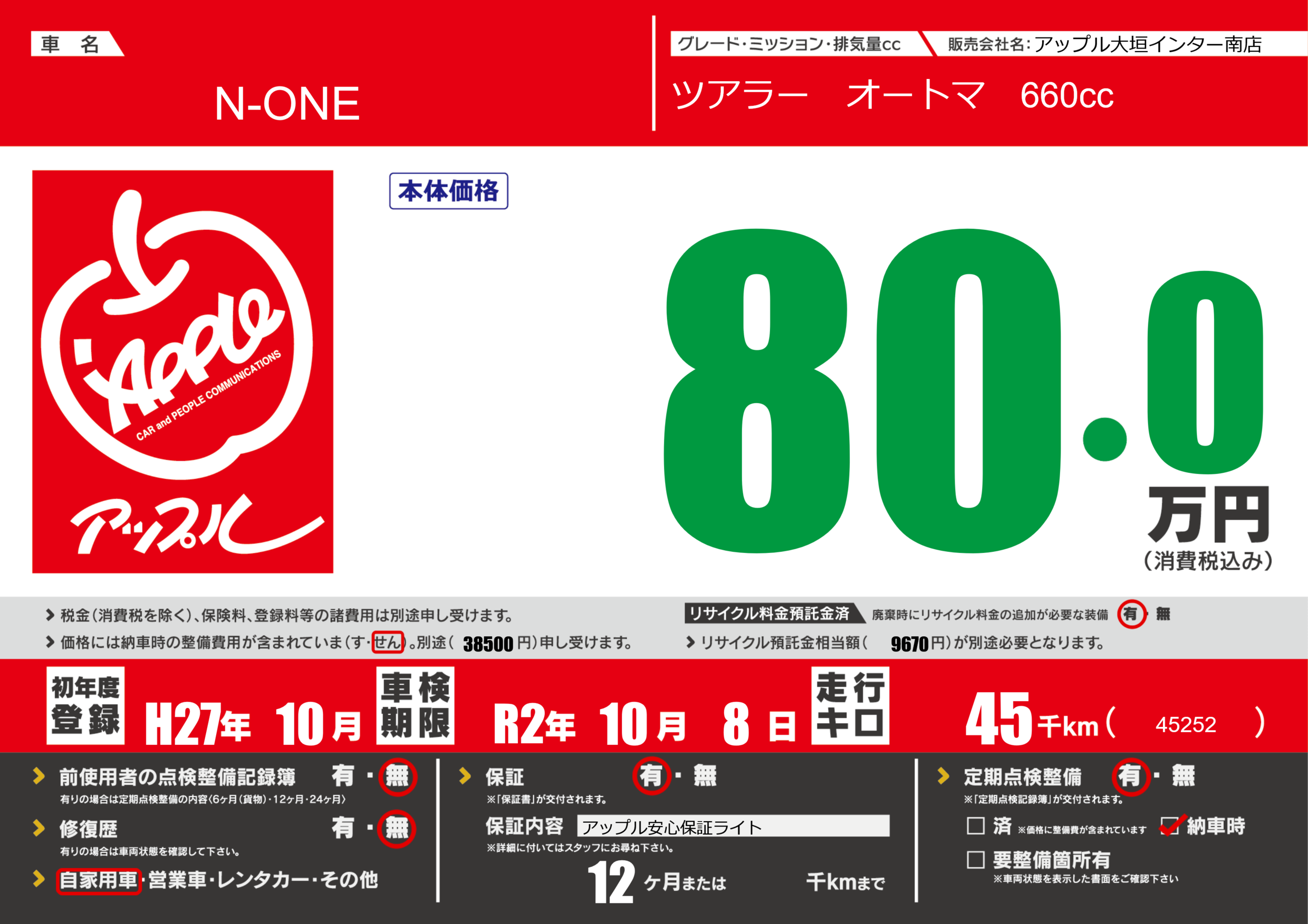 | 車名 | N-ONE | グレード ミッション 排気量 |